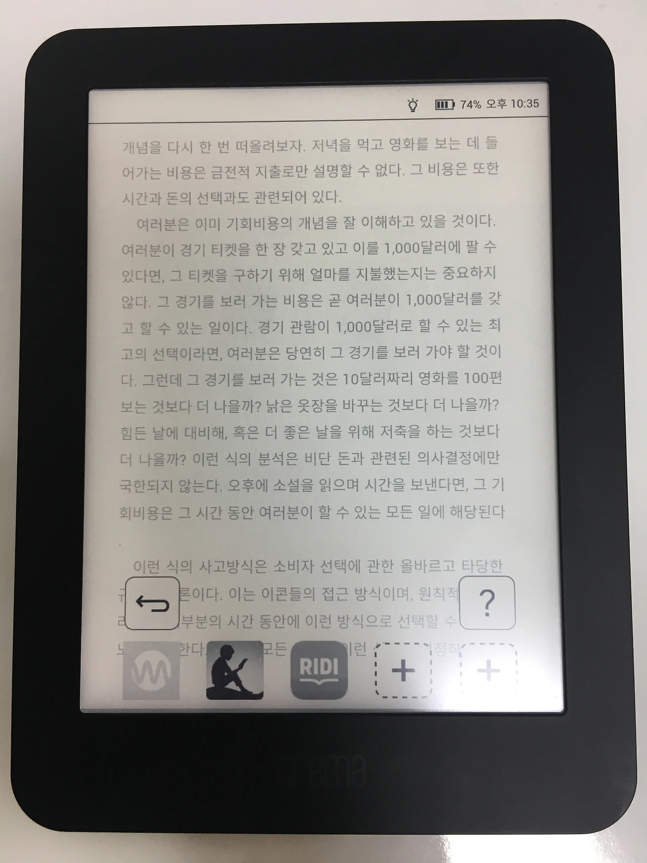 하지만 아직 단점이 있다. 기계에 어플이 최적화가 안되었는지, 어플에서 폰트를 내 입맛대로 정하고 책을 넘기면 일정 페이지를 스킵하고 그냥 넘어가는 문제 발생 - 해당 담당자에 문의했더니 기본 폰트와 여백으로 보라고 한다/ 그래도 문제는 해결되지 않음.