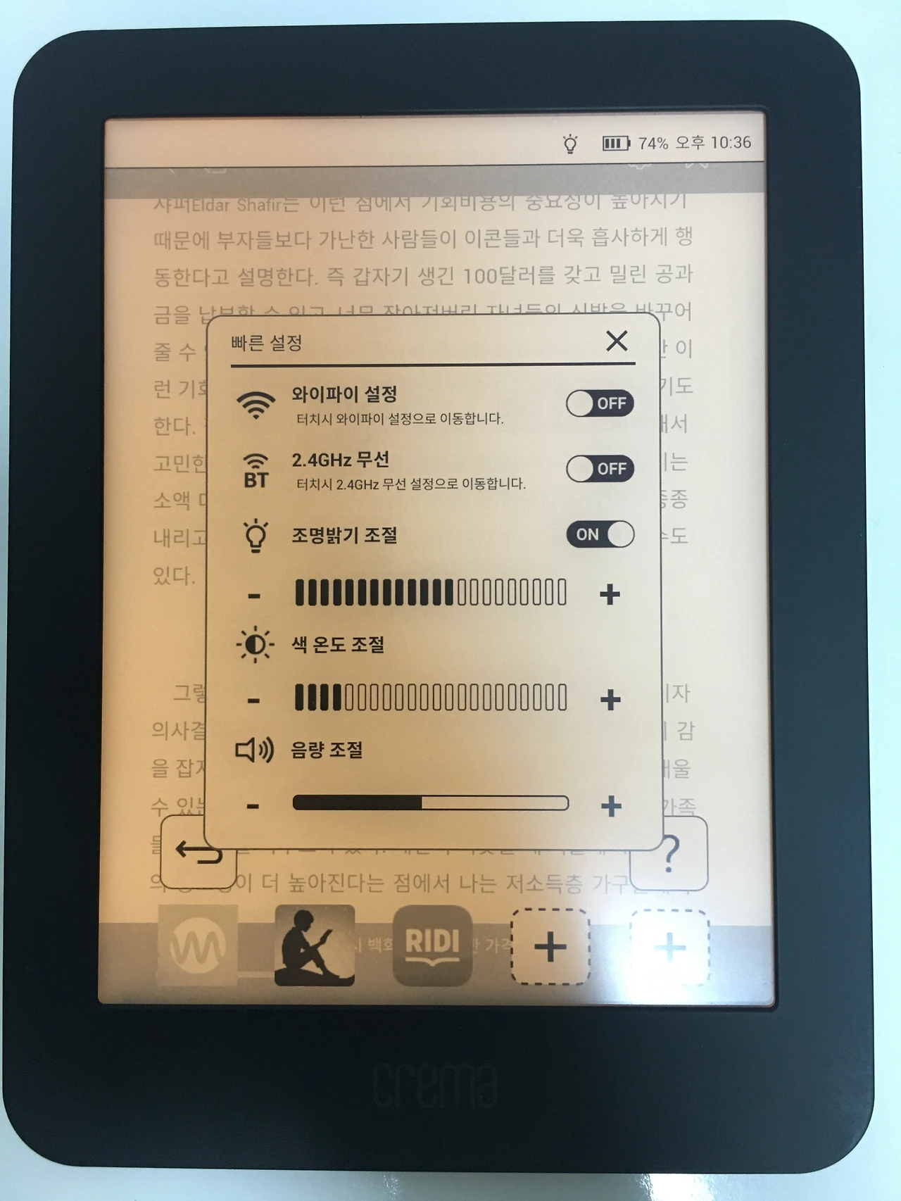 끝으로 크레마 그랑데의 특색을 꼽자면 색온도 옵션이다. 이것은 아이폰, 아이패드에서의 "나이트 시프트"와 비슷한 옵션이다. 한 밤에 책을 읽을때 색 온도를 낮추면 눈이 덜 아프다. 그리고 잠도 잘온다.
