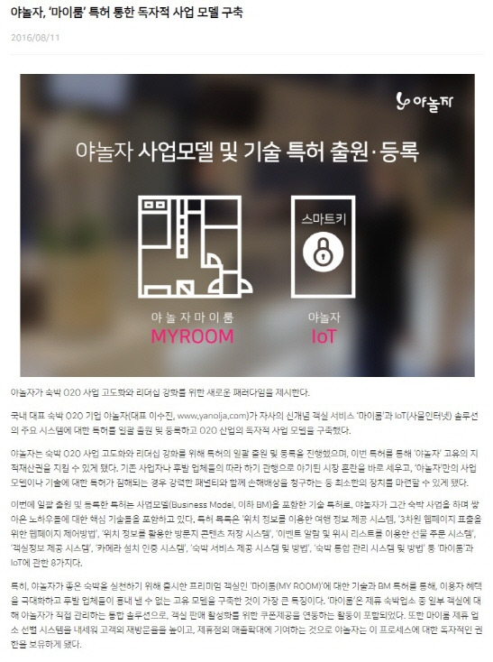 개인적인 기대감 또는 흥미와는 다르게, 야놀자의 감정의 골은 꽤 깊을 것 같다. 야놀자는 2016년도 8월에 아래와 같이 '마이룸' 특허 확보를 자사 홈페이지 등에 공시하고 보도자료를 준비할 만큼 특허 침해 발생 시 강력한 조치를 취한다는 각오를 다지고 있었던 것으로 보인다.