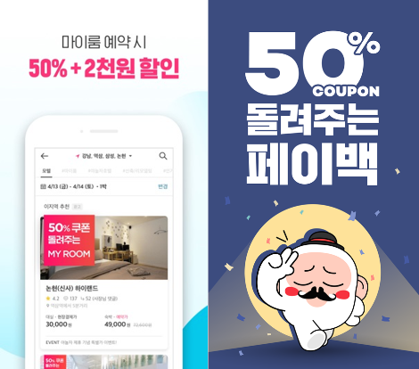 여기어때는 마이룸 서비스와 유사한 페이백 서비스를 제공하고 있다. 서비스 내용만 비교해보면, 재방문 시 50% 할인 등 전체적인 메커니즘은 얼핏 동일한 것으로 보인다.