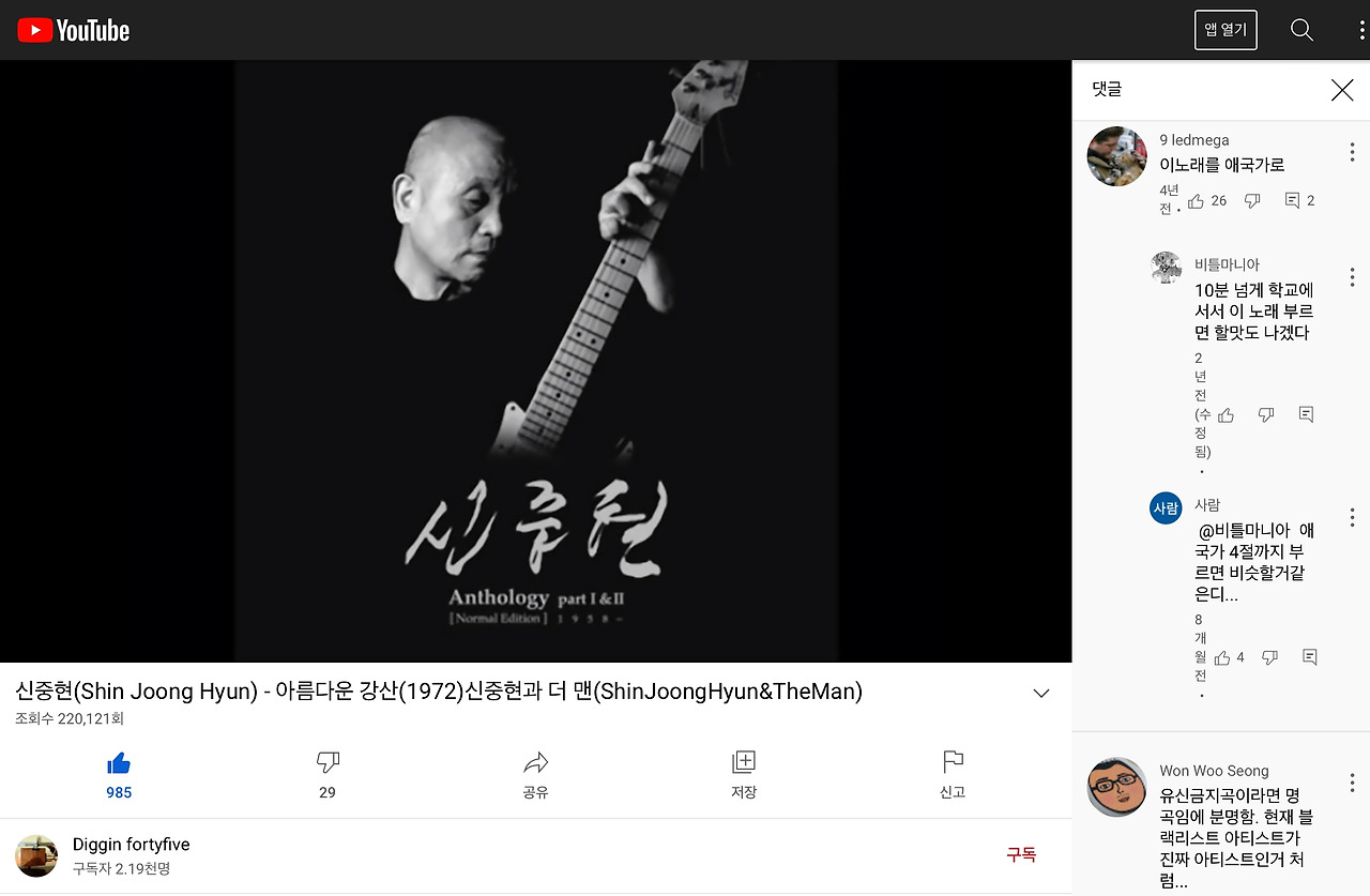 댓글이 재밌었습니다 ‘이 노래를 애국가로’ 했으면 좋겠다는 댓글이 몇 개 있더군요. 그 아래 줄줄이 달리는 댓글도 재미있습니다. 학교 운동장에 서서 10분 넘게 노래 부르는 모습에 관한 댓글도 있네요. 원곡은 뒷부분의 연주를 포함해서 십 분이 넘는 대곡입니다. 신중현의 ‘아름다운 강산’은 이선희의 힘찬 목소리로 다시 불렸지만. 원곡은 신중현의 천재성이 강산을 아름답게 그립니다.
