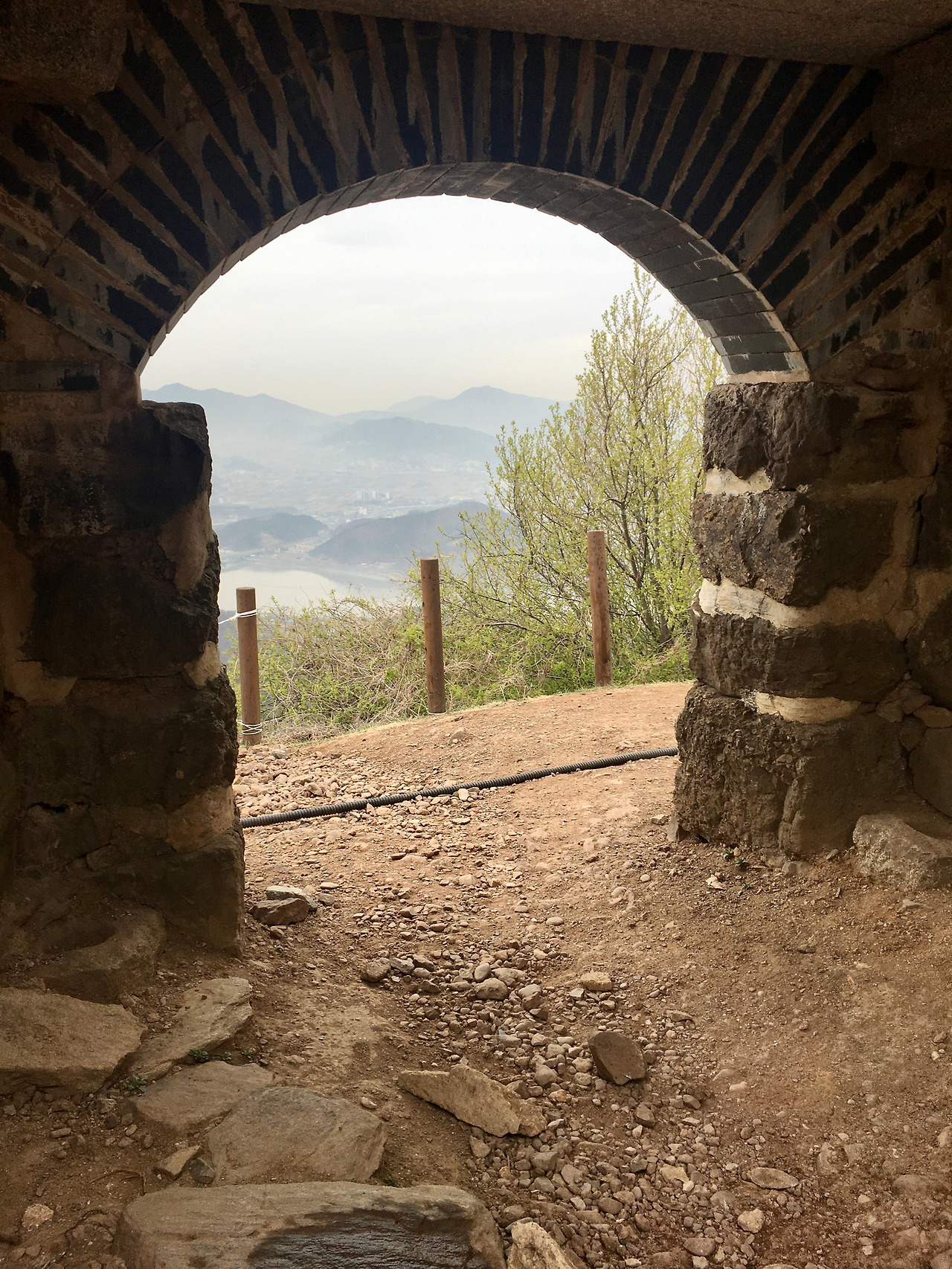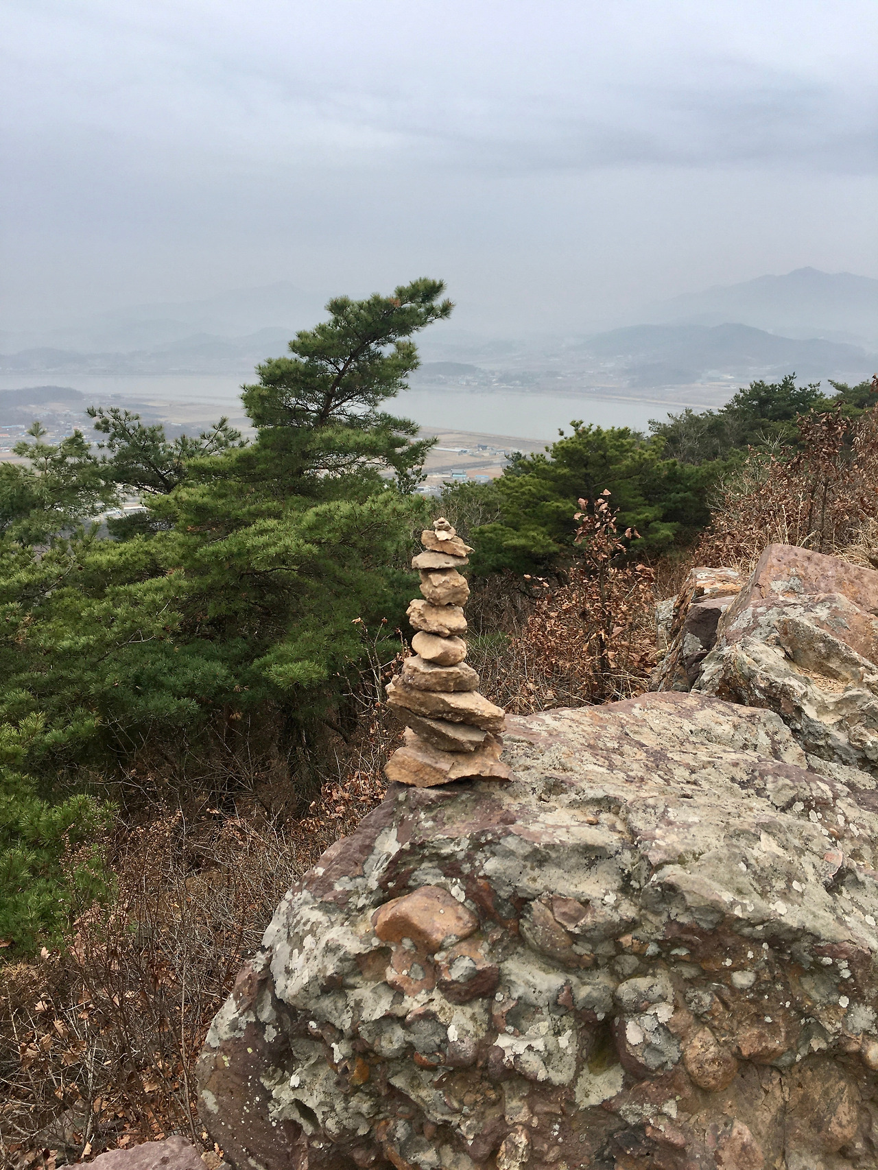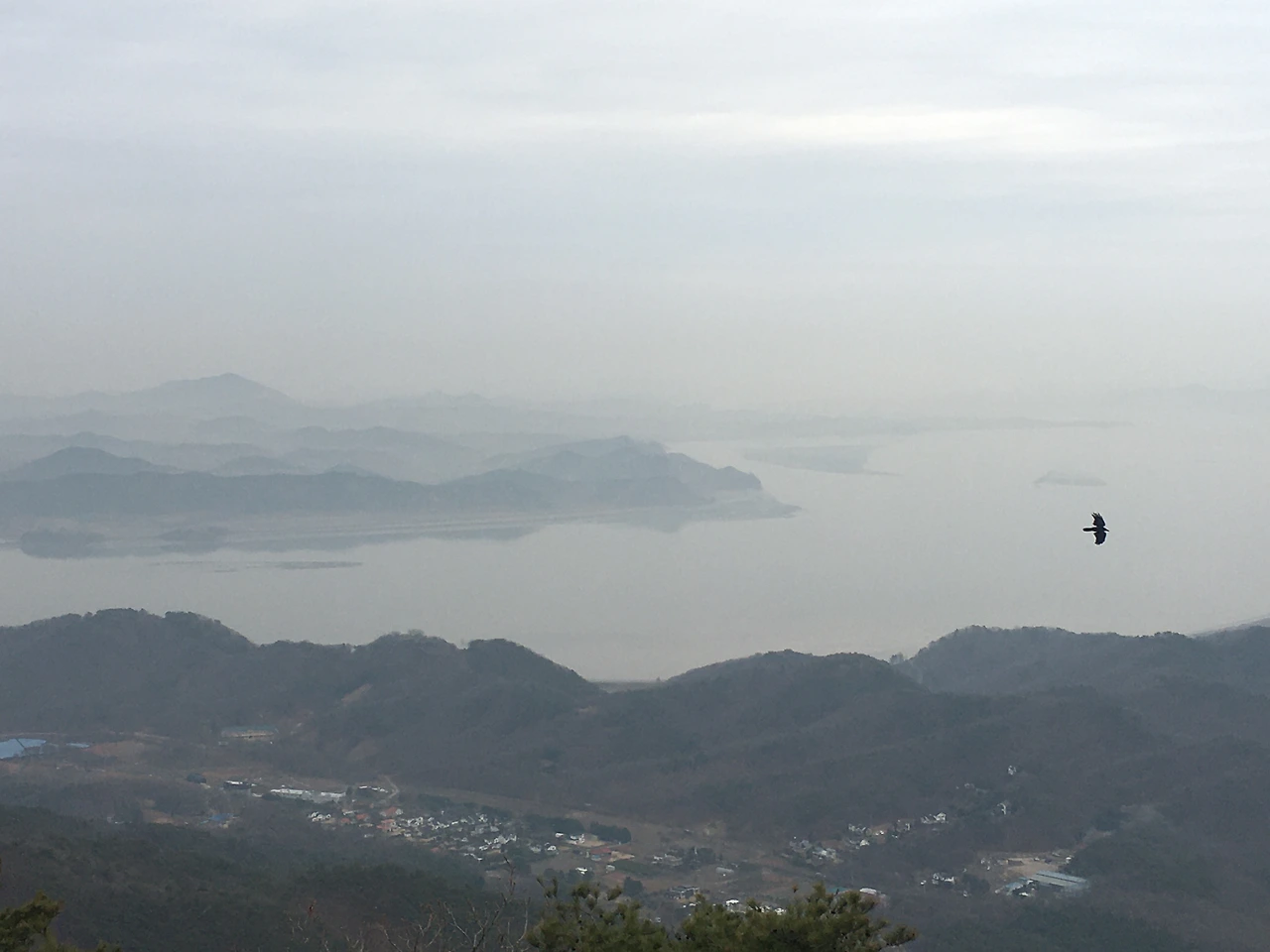여러 산길이 있는데, 오늘 올라간 1코스 우측 길은 문수산성 따라 강과 바다를 보며 산행할 수 있습니다. 정상에 오르면 사방이 확 트여 강화대교 주위 굽이진 물길과 서해, 그리고 북녘땅을 볼 수 있는 곳이지요. 가슴이 뻥 뚫립니다. 정상에서 사진을 찍는데 마침 새가 날아갑니다. 찍고 보니 흐린 배경과 묘한 조화를 이루어 동양화 같은 사진 한 장 얻었습니다.