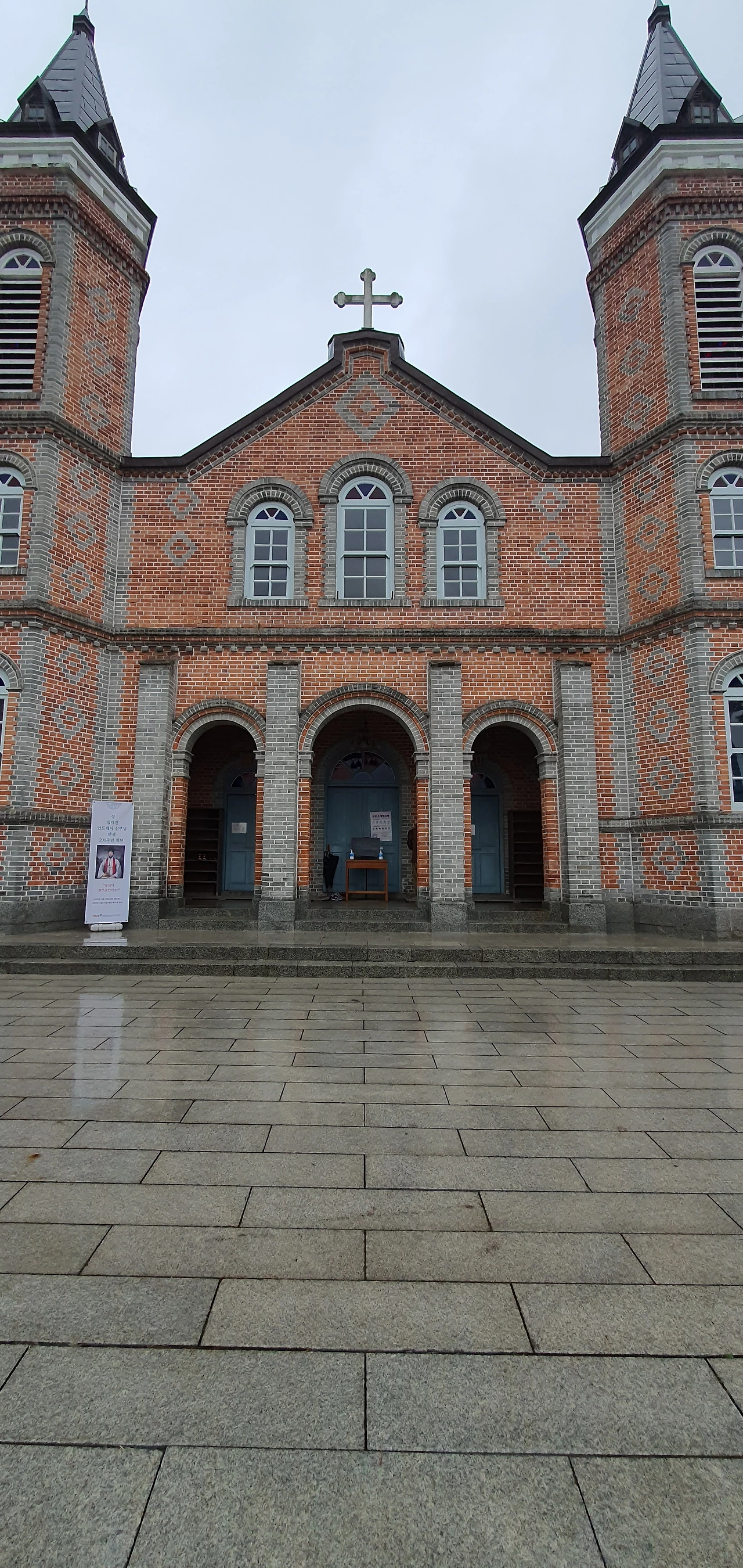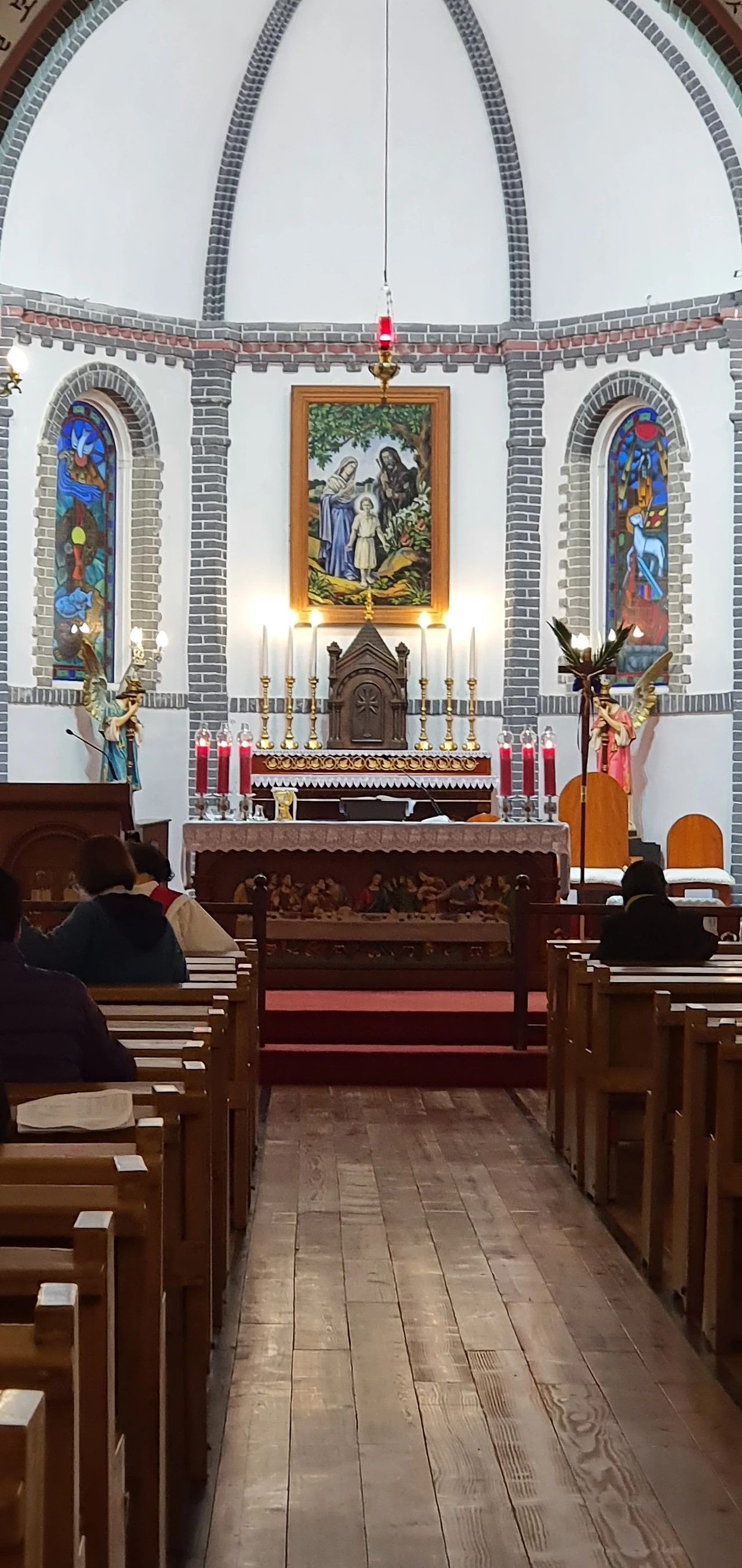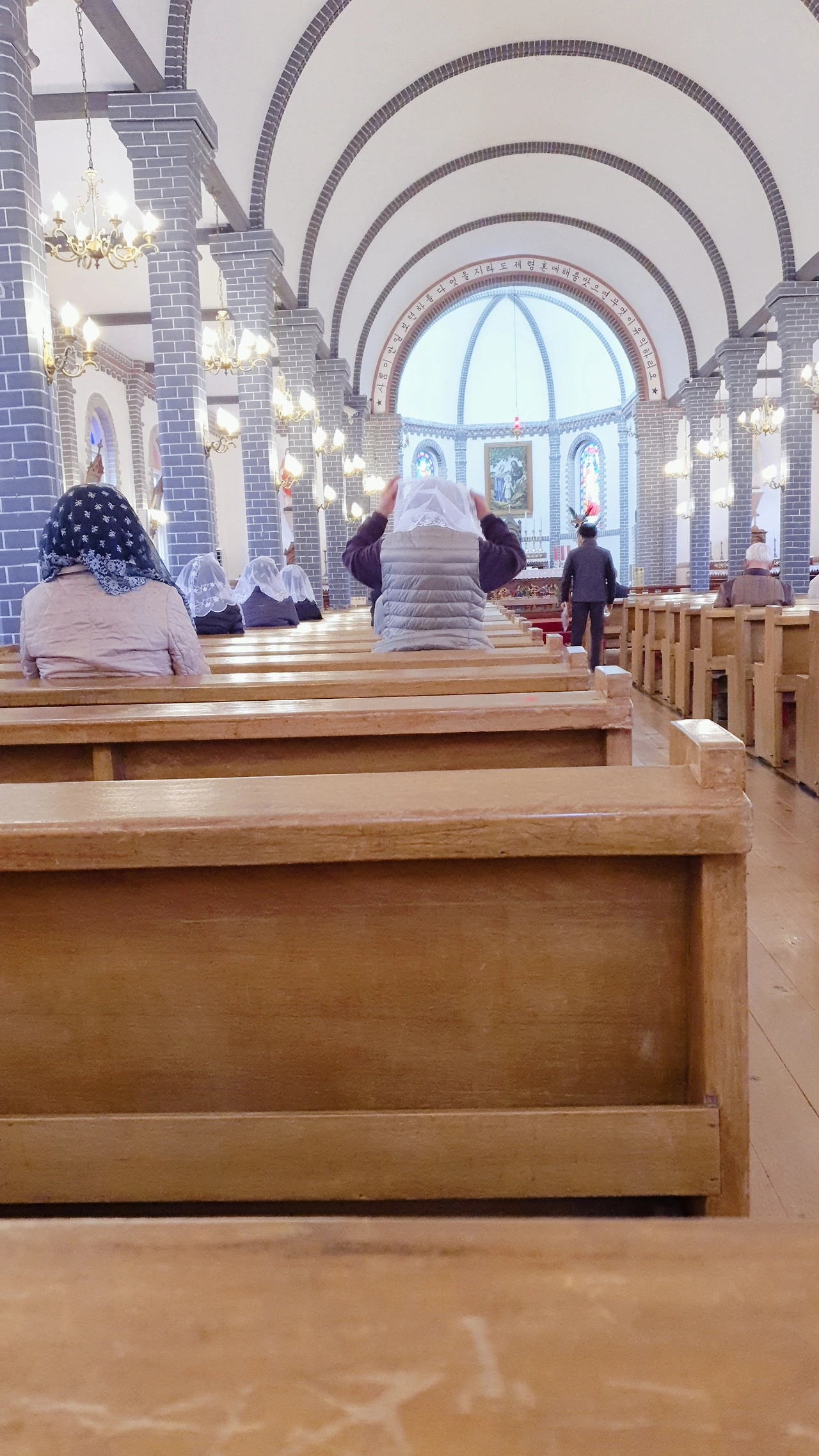 바닥이 촉촉이 젖어 있습니다. 코로나로 일정 수의 신자들만 미사에 참석하는 것 같습니다.