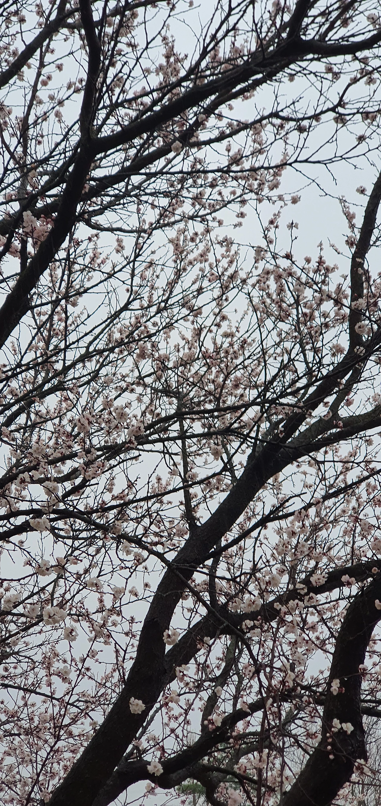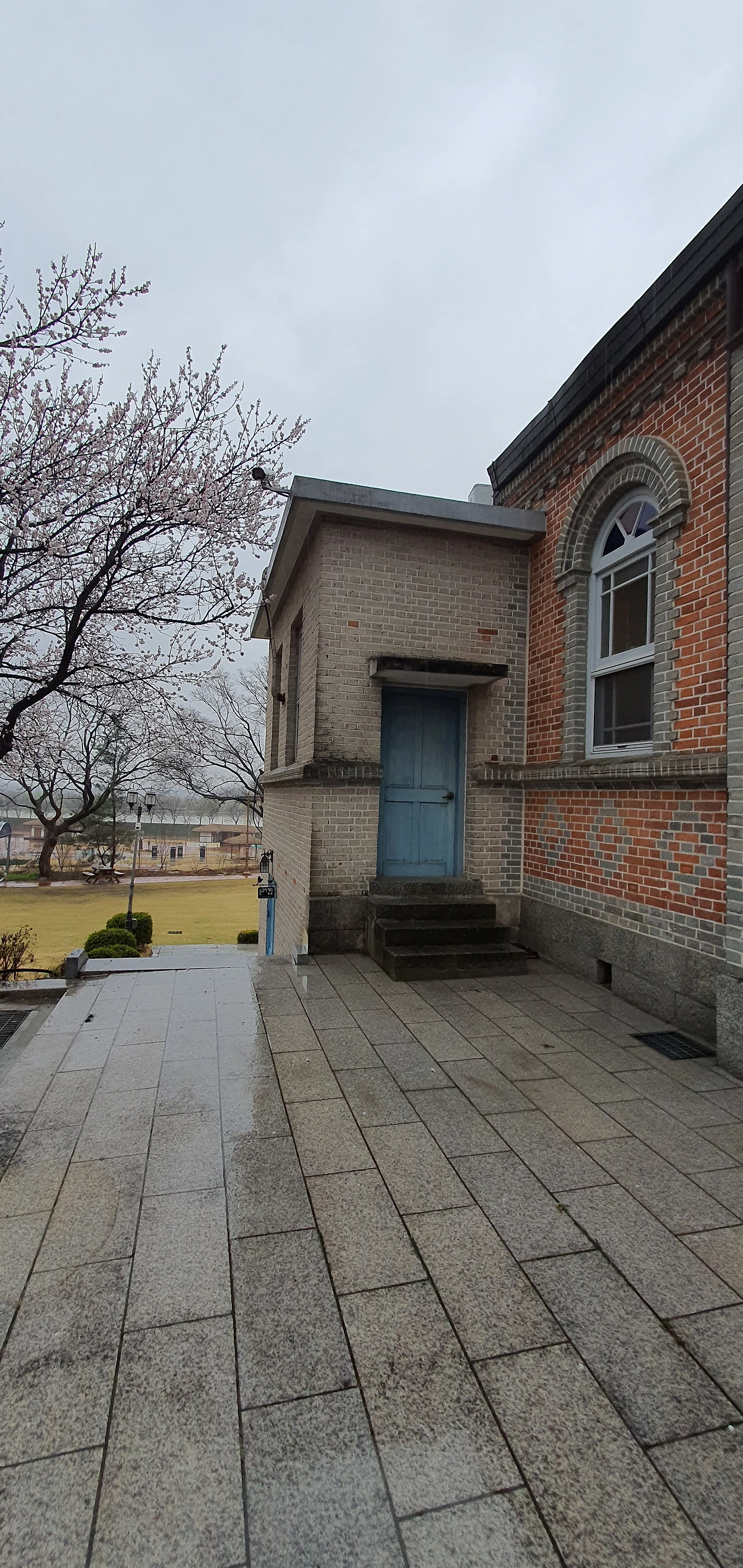 건물 왼쪽으로 돌아가면 저 앞에 벚나무가 큰 가지를 내리고 꽃을 활짝 피우고 있습니다.