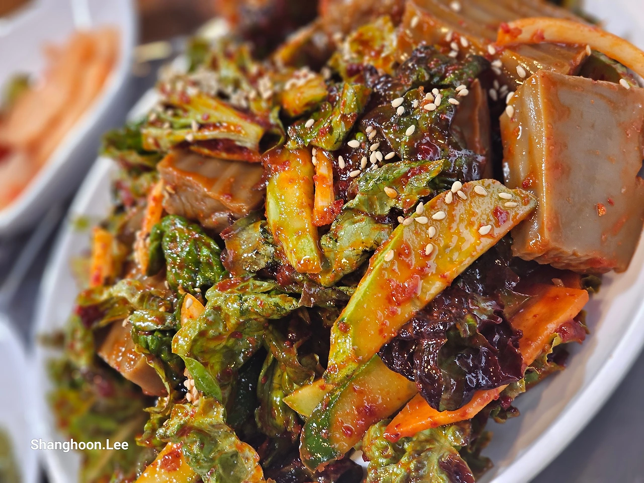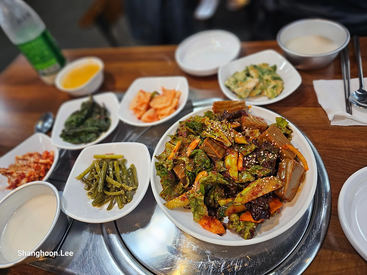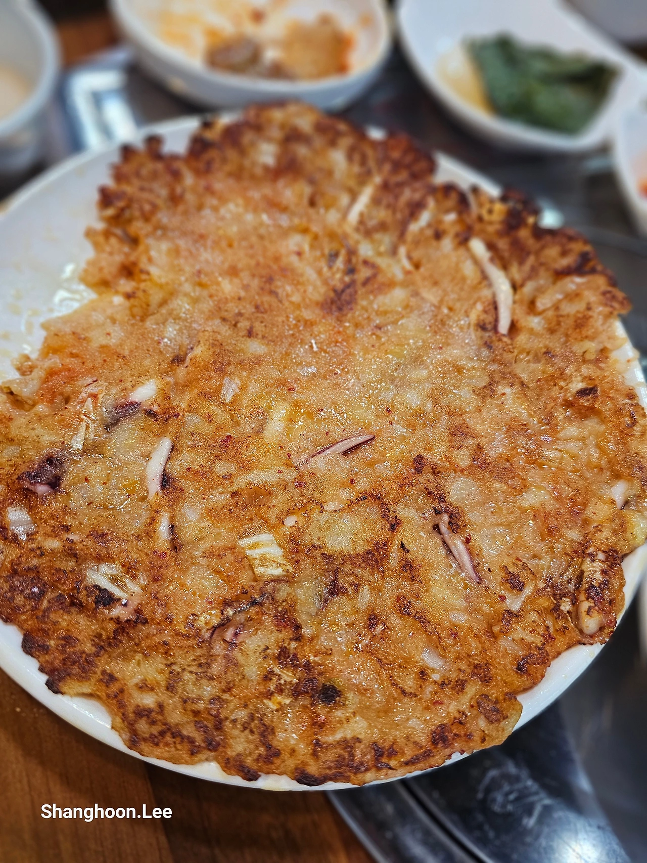 술안주는 감자김치 오징어 전 하나와 도토리 묵 한 접시를 시켰습니다. 대한민국 사람 모두 비가 오면 파전을 찾는 다는데 남녀를 불문하고 식당 자리는 많이 채워져 있네요. 이러니 비 오는 날 파전은 진리라는 생각이 더 굳어지는 것 같습니다.