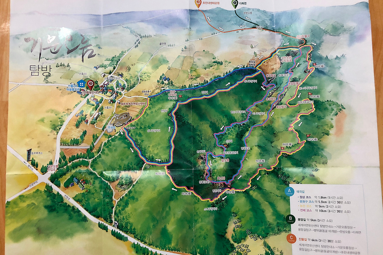- 거문 오름 : 천연기념물 제444호. 거문 오름이라는 이름은, 유난히 검은빛을 띠는 돌과 흙에서 유래되었다. 어원적으로는 신령스러운 산이란 뜻도 있다고 한다.
