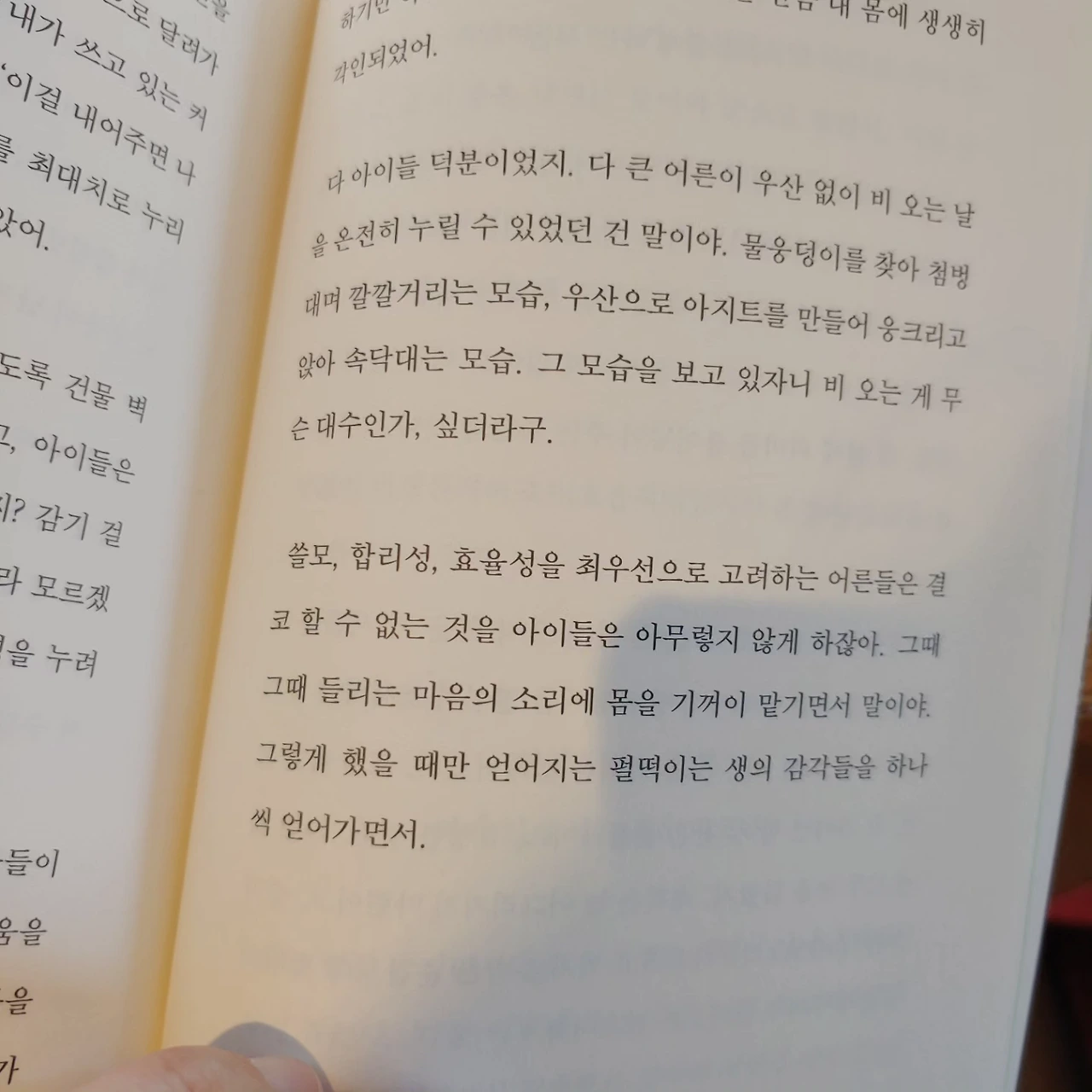 챕터를 마무리하는 문장은 내 마음에 정확하게 푹 꽂혀 나를 위로하거나, 공감을 불러일으키거나, 때로는 어떻게 살아야겠다는 다짐까지 하게 만드는 만능 약을 먹은 듯한 기쁨을 주었다.