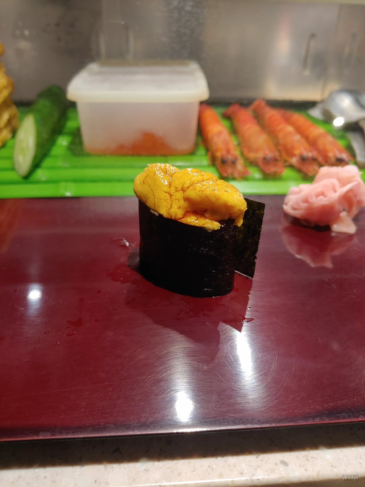 다이와스시 우니 초밥.다이와스시는 새우, 참치 주토로 초밥을 거쳐 오마카세가 절정에 다다랐을 때 우니 초밥을 내놓았다. 군함 말이로 만들어 우니 부분이 위쪽으로 봉긋하게 올라와 있는데, 입 안에 넣으면 국수를 호로록 먹듯이 입안에 호로록 들어와 금세 사라질 것처럼 부드러워 보였다. 노르스름한 색에서 영롱함이 느껴지는 우니의 맛을 추측하고 있자니 미지의 세계를 탐험하는 기분까지 들었다.