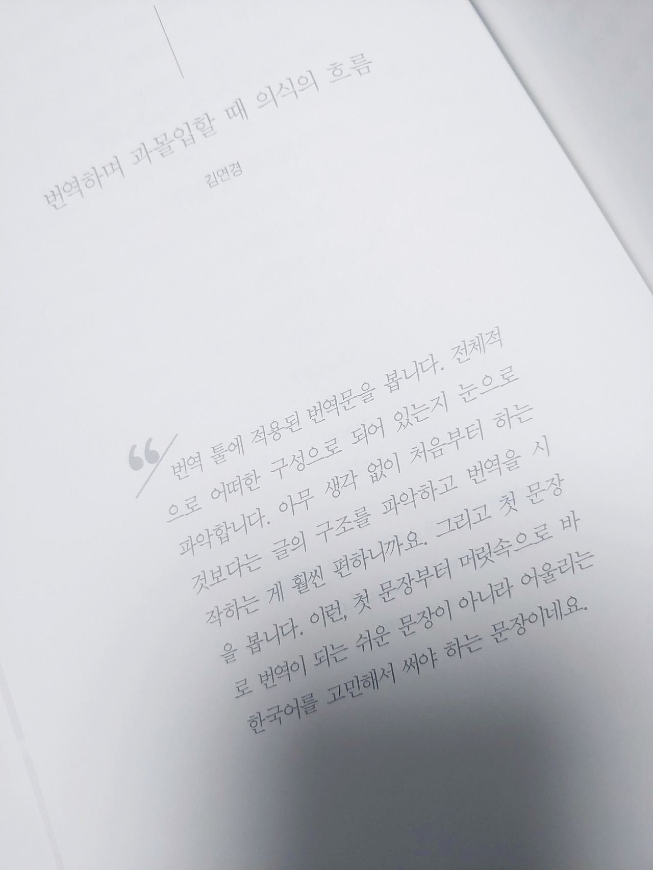 매거진을 받아 첫 페이지부터 차근차근 읽고 있는데 상당히 흥미롭습니다. 오늘 받았기에 3분의 1 정도 읽었지만, 글을 읽으면서 저도 모르는 새에 붉은 펜을 들고 와 줄을 그으며 읽고 있었네요. 번역하시는 분들에게는 정서적, 이론적으로 도움이 되는 알잘딱깔센 책인 것 같습니다. 아, 이건 그냥 생각나서 쓰는 건데 일단 제 글은 전혀 어렵지 않습니다. 그러니 부담 없이 가볍게 읽어보셔요. 컴 온, 컴 온.
