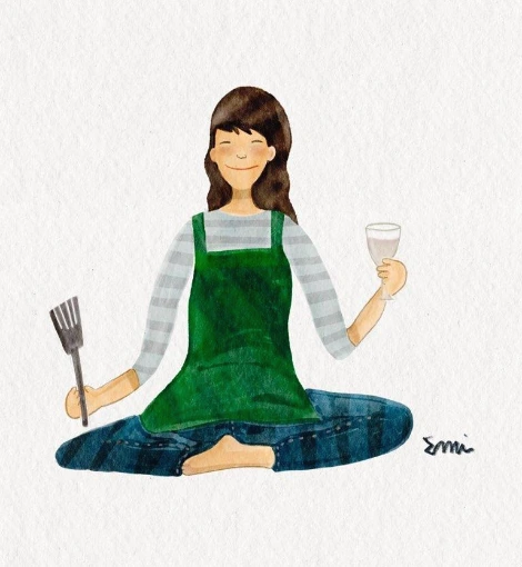 명절날, 전을 부치며 와인을 홀짝이는