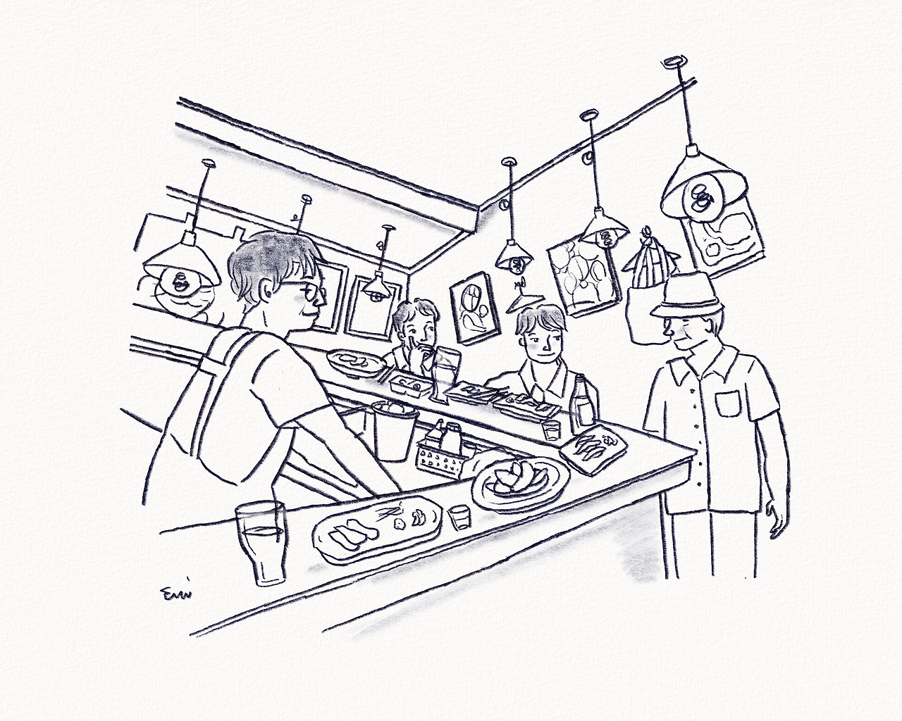 도쿄 유학시절 롯폰기에 있는 지인의 한식당에서 아르바이트를 한 적이 있다. 일주일에 고작 하루였지만 어학원 수업이 끝나자마자 달려가서 간단히 저녁을 먹고 한류 열풍 덕에 밀려드는 손님들을 맞아야 했다. 그러다가 막차를 타고 집으로 돌아와 뜨거운 물에 샤워를 하고 마시는 차가운 맥주 한 캔은 참으로 달았다. 오늘이 끝나고 내일 시작되기 20분 전... 지금도 모두의 기억 속에 회자되는 인생 드라마, 심야식당이 방영된다. 내가 아르바이트를 하는 목요일 심야에 방영되는 이 드라마는 고되고 지쳤던 내 하루를 맛있는 음식과 사람들의 이야기로 위로하곤 했다. 언젠가 서울로 돌아가면 내가 사는 집 근처에 저런 식당이 하나쯤 있었으면 근사하겠다는 생각이 들었다. 며칠 전 선선한 초가을의 바람을 맞으며 지인의 손에 이끌려 조그만 일식당에 갔다. 기억자 모양의 카운터에 적당한 간격을 두고 둘러앉은 손님들은, 주인장이 알아서 만들어 주는 다양한 음식들을 나눠 먹는다. 그러다 서로 눈이 마주치면 슬쩍 미소를 짓기도 하고, 술잔을 가볍게 들어 올려 건배를 청하기도 한다. 좁은 식당은 어느새 손님들의 웃음과 이야기로 넘쳐나고, 각자의 이야기에 집중하다가도, 라디오에서 흘러나오는 듯한 옆 손님의 사연에 귀를 쫑긋 세우기도 한다. 생일을 맞아 온 손님에게는 낮은 목소리로 축하 인사를 건네고, 기념일을 맞은 커플에게는 오래오래 행복하라고 빌어준다. 손님들이 편안하게 먹고 마시는 것을 최우선으로 생각하는 주인장은 고작 열 개도 안 되는 카운터 좌석이 다 차면 더 이상 손님을 받지 않는다. 흔한 대기자 명단도 없다. 가게 앞의 야외 테이블은 절대 자리가 없다는 이유로 그냥 돌려보낼 수 없는 손님을 위해 언제나 비워놓는다. 참새가 방앗간을 그냥 지나갈 수 없는 것처럼 늦은 퇴근길에 반드시 이곳에 들렀다 가는 참새 같은 손님이 날마다 있으니까. 그날도 예외는 아니었다. 밤 10시가 훌쩍 넘은 시간, 중절모를 쓴 어르신 한분이 가게 문을 열고 들어오셨다. 주인장은 반가움과 동시에 난감한 표정을 짓는다. 그러자 어르신은 창밖으로 고개를 돌려 야외 테이블을 힐끔 본다. 그리고 가볍게 고개를 끄덕이는 주인장의 허락이 떨어지자 가게 문을 조심조심 닫고 야외 테이블에 앉았다. 나와 눈이 마주친 주인장은 칼질을 하며 말한다. “ 우리 집 단골이에요. 우리 집을 참새 방앗간이라고 부르시죠 ” 한 손님이 오늘은 이상하게 기분 좋은 날이라며 스페셜 요리를 주문해 모두에게 나워준다. 그 요리에 감동한 옆자리 지인이 차가운 맥주 한 잔을 모두에게 돌리고, 주인장은 뚝딱 간단한 안주하나를 서비스로 내어준다. 어느새 허물없이 서로의 이야기에 끼어들게 된 손님들이 목소리를 높여 갈 때, 가게 문을 열고 들어온 어르신이 5만 원짜리 지폐 한 장을 주인장에게 내밀며 무심하게 말했다. “ 잘 먹었어. 내일 또 봐.” 그리고 가게 안의 손님들에게 잠시 목소리를 가다듬고 푸근한 미소를 지으며 말했다. “ 다들 맛있게 먹고 마시고 화복 한 시간 보내시오. 이 집은 맛집이야. “ 그리고는 가게문을 열고 나가셨다. 순간, 가게 안에 짧은 침묵이 흘렀다. 어르신의 강렬한 인사말에 주인장도 손님들도 감동받은 것이다. 그날 밤 이곳에 모인 우리 모두는 행복했다. 각자의 사연을 심심하게 털어놓으며 배를 잡고 웃어댔다. 이렇게 나에게도 드디어 심야식당이 생긴 것이다. <아네고 에미>