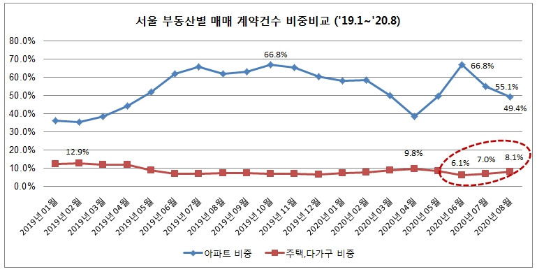 서울지역 8월 주택거래량에서(아파트, 빌라, 단독 포함) 단독·다가구가 차지하는 비중이 7.7%로 전월(7.0%) 대비 0.7% 포인트(p) 늘었고, 증가세는 2개월 연속(6.1%→7.0%→7.7%) 이어졌다.