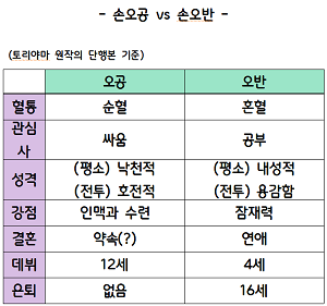 여기서 작가 토리야마와 편집진은 실로 탁월한 인물 조형 능력을 발휘하여, 그 쉽지 않은 미션을 성공적으로 완수한다. 오반은 오공과는 완전히 다른 매력의 캐릭터가 된 것이다. 다음의 표를 보자.