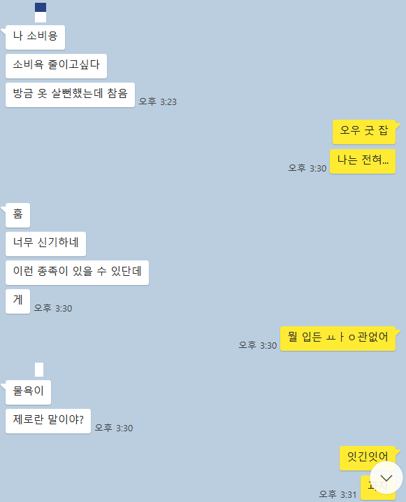 언니는 요즘 지출을 줄이는 것에 열심히다. 외식도 잘 안하려 하고, 안 쓰는 물건들은 중고로 판매하면서 조금이라도 돈을 모으려고 하고 있다. 그러나 언니는 이따끔 물욕이 없는 내게 상담을 받고자 '이거 너무 너무 사고 싶다'고 카톡을 한다. 내 눈에는 그렇게 예뻐보이지도 않거니와 지출을 줄이는 것을 도와주고자 그거 하나 사면 그간 언니가 중고거래한 것들 다 물거품되는 거라며 말린다.