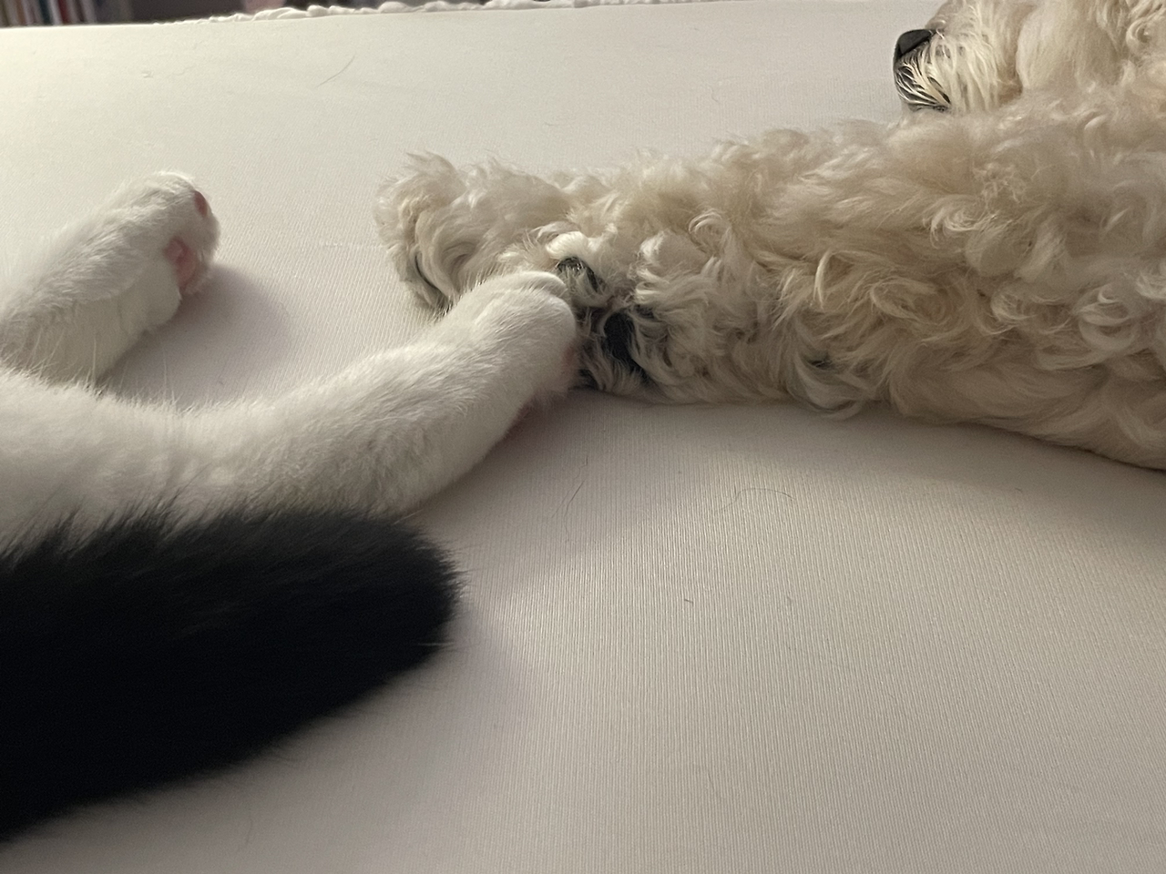 나는 알람없이 일어나고 싶을 때 일어나는데 보통 9시쯤이다. 어쩔 땐 8시, 혹은 10시에 일어나기도 한다. 일어나서는 세척된 사과 하나를 혹은 엄마가 미리 잘라둔 사과조각이 있으면 그걸 먹는다. 그리고 검은콩 두유 한잔을 마신다. 그 다음에는 나의 소중한 털달린 아기 고양이들과 강아지의 물그릇들을 새로 한가득 채워준다. 그리곤 이 아이들의 화장실을 청소해준다.