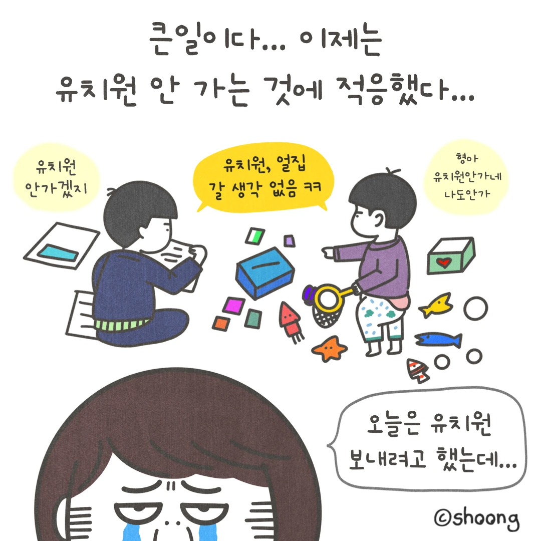 #엄마마음 #애들마음 #동상이몽 #ㅋㅋㅋ #유치원 #어린이집 #안가 #자연스러워#형제는용감했다 #엄마 #더이상놀아줄게없다 #그냥뛰어 #내일은뭐하지 #먹고놀고먹고놀고 .