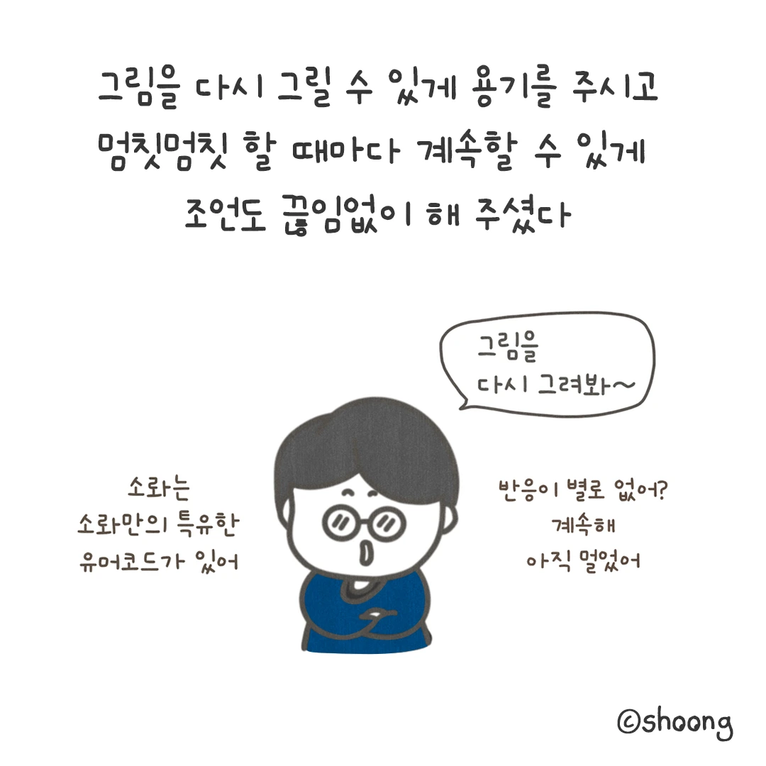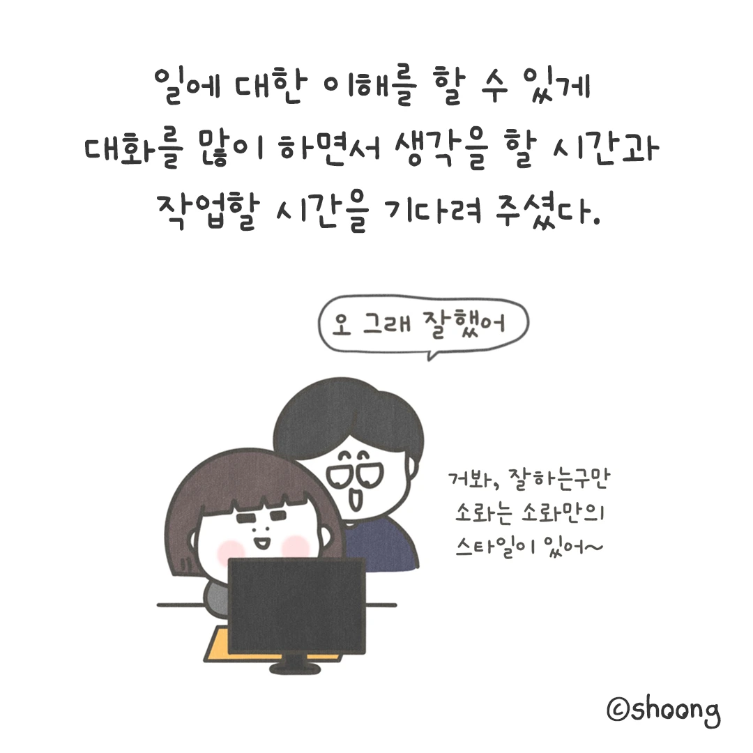 대화를 많이 하면서 작업에 대해 이해하고 뭔가를 더 끌어낼 수 있게끔 기다려주고 격려도 많이 해주셨다.