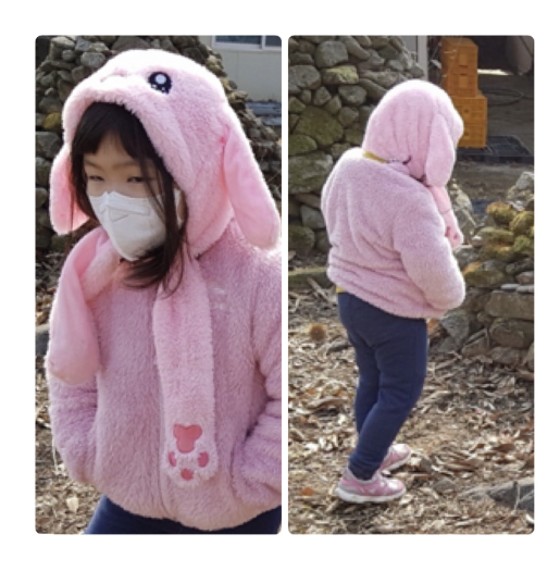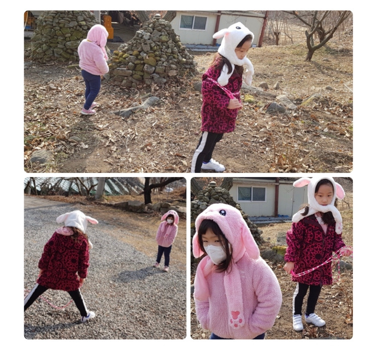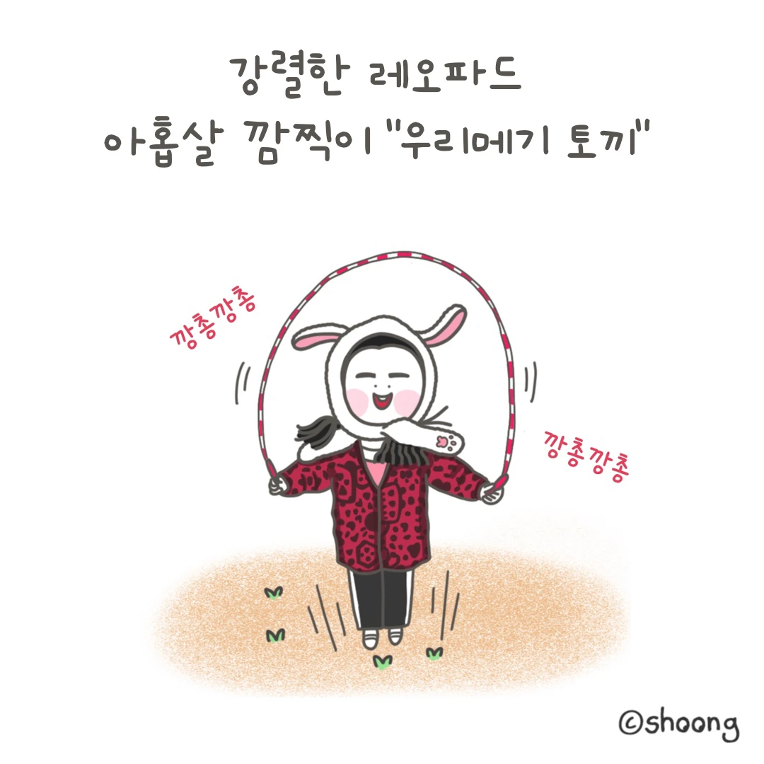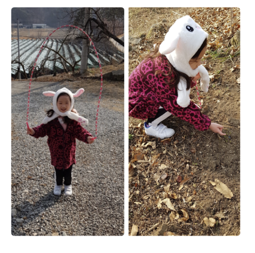 어디서 샀는지 모를, 와우~ 강렬한 레오파드 옷에, 토끼 모자를 쓰고, 초등학교에서 배운 줄넘기를 열심히 깡충깡충 뛰는 게 귀엽지만 옷만 보면 강열한 레오파드 토끼 같고 ㅋㅋ