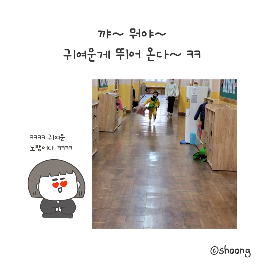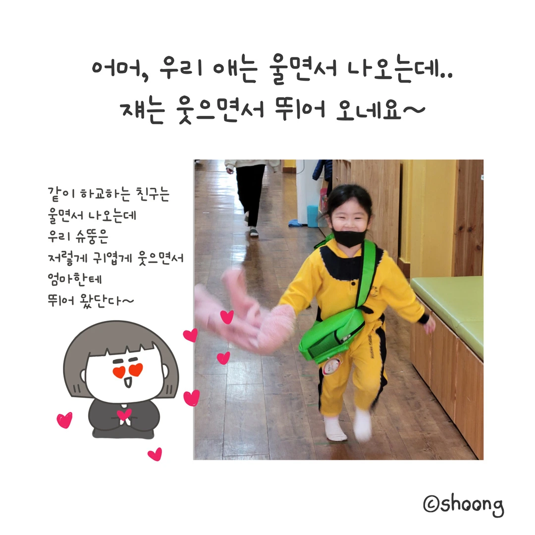 친구는 울면서 나와서 엄마가 해맑게 뛰어나오는 슈뚱 부러워했다는데, 저렇게 웃으면서 뛰어와주면 세상 근심 걱정 사라질 것 같다 ㅋㅋㅋ