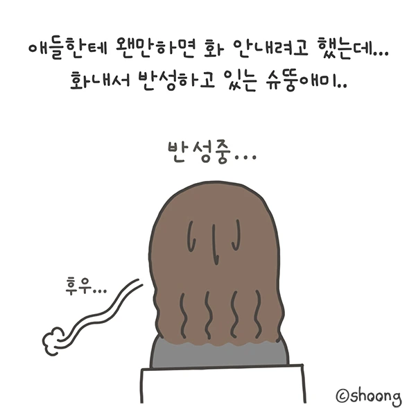 애들한테 화를 내지 않기로 다짐을 하지만 또 화를 냈다고 자책하고 있은 슈뚱 애미...