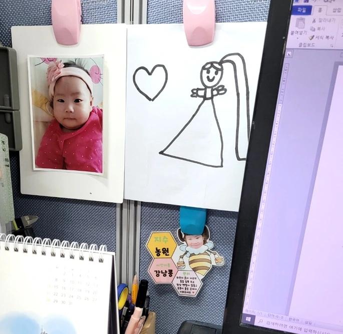 감동받은 슈뚱 애미는 그림을 회사에 가져와 책상 앞에 붙여 두었다.
