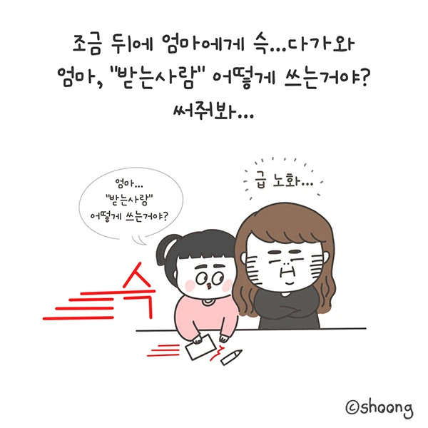 잠시 후 자책하고 있는 엄마에게 오더니 슈뚱이 만든 봉투를 보여주더니 "받는 사람"은 어떻게 쓰는 거냐고 물어보길래 "받는 사람"이라고 봉투에 써줬더니 그 옆에다 무언가를 적는 슈뚱