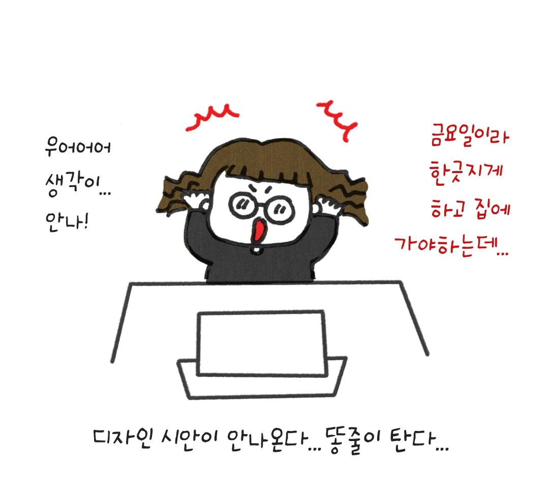 기안 84가 웹툰을 매주 화요일까지 완결해서 보내야 하는 것처럼 나도 매주 금요일까지 기획전을 3~4개씩 만들어야 했고 중간중간 다른 일도 해야 했다. 월요일에 기획서를 받아 빠르게 아이디어를 생각해내야 하고, 화요일엔 1차 시안 컨펌을 받고, 수요일엔 2차 시안 컨펌을 받고, 목요일엔 최종 시안을 만들어 금요일에는 넘겨줘야 했다. 최악의 경우 금요일까지 디자인이 나오지 않으면 욕 들어 먹고 주말까지 일을 가지고 가서 집에서 일을 했어야 했다.
