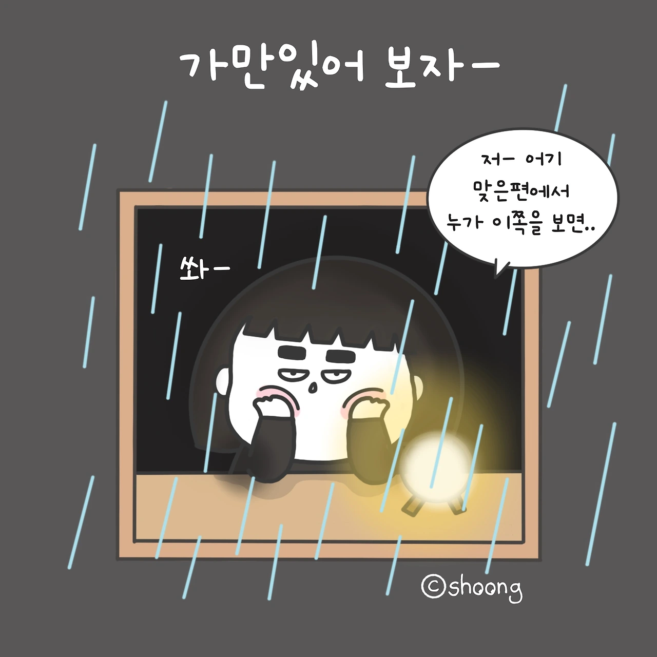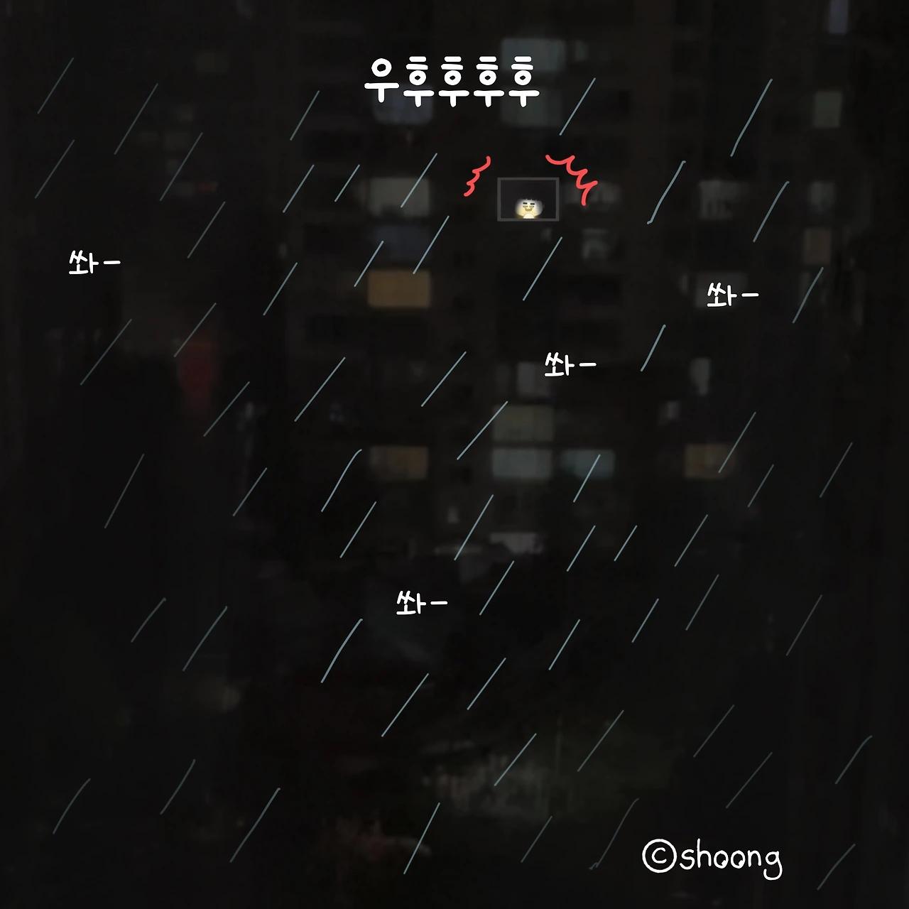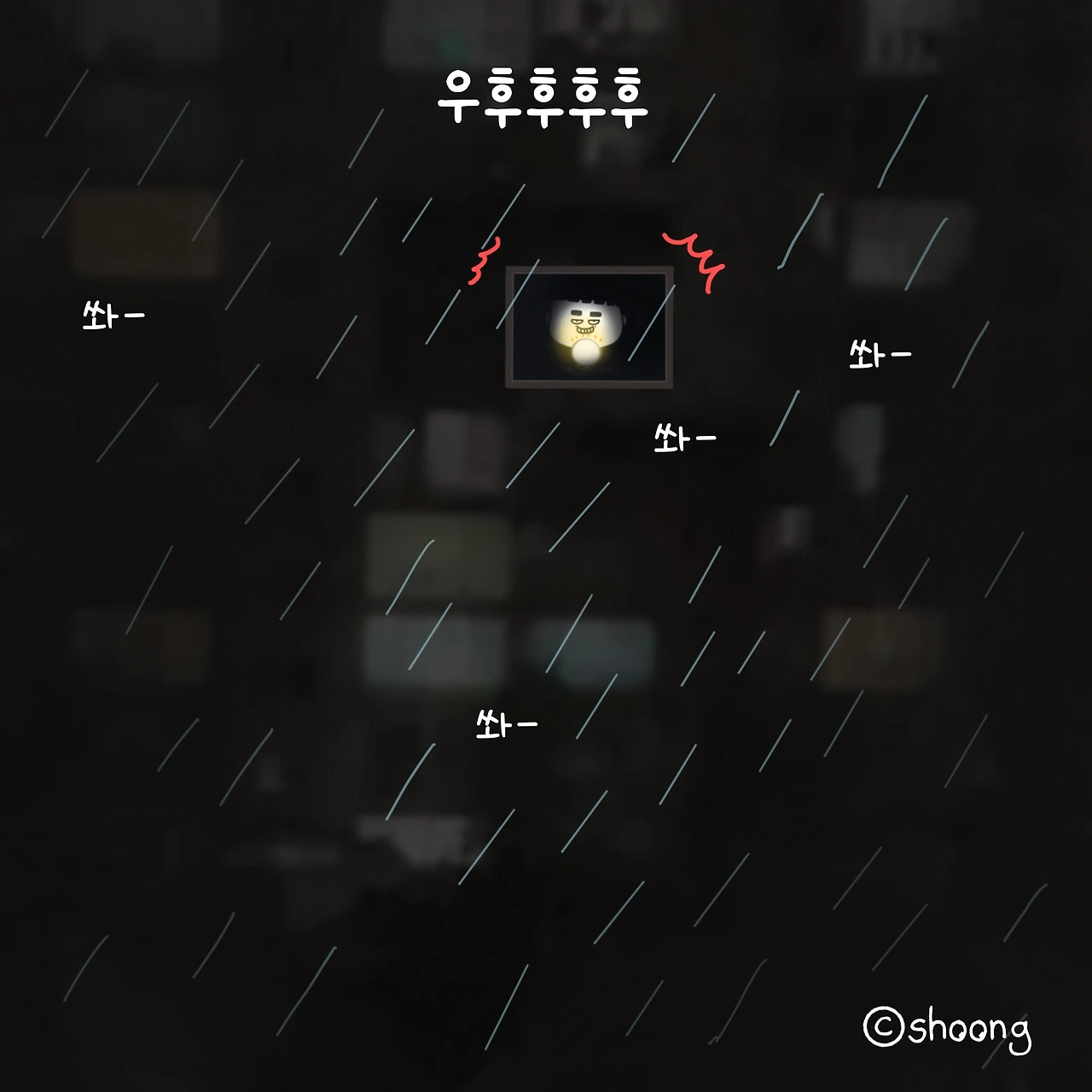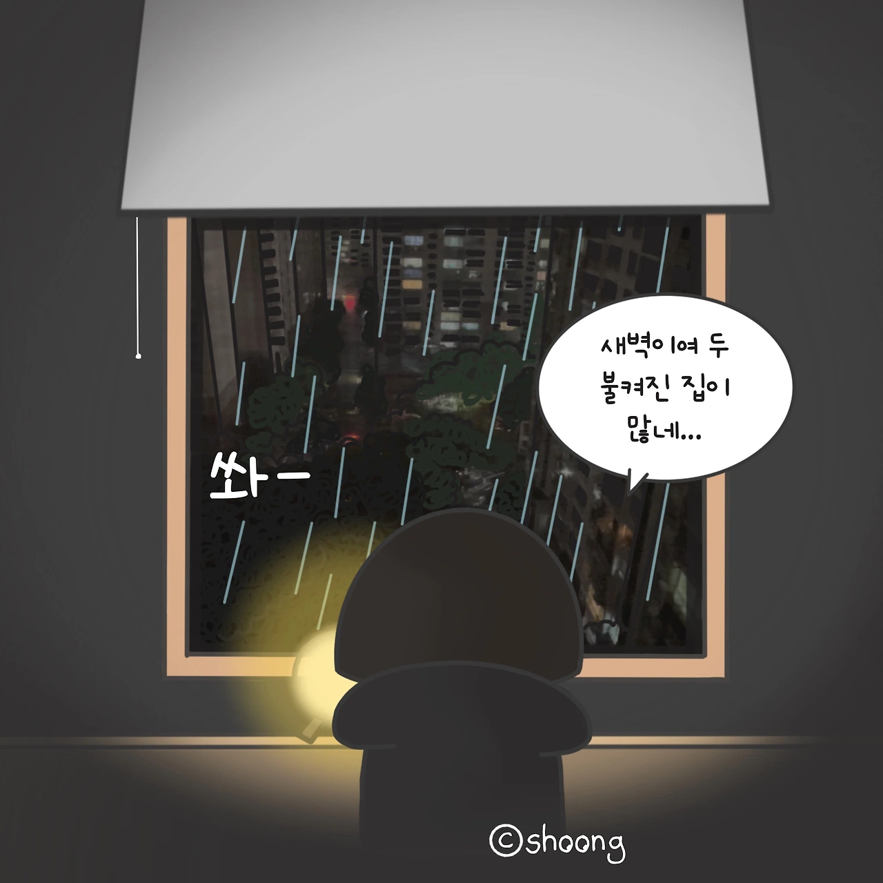 #비오는날#새벽#풍경#아파트숲#엉뚱한상상#나홀로#호러물찍기#ㅋㅋㅋ#shoong#슝#공감툰#일상툰#웹툰#손그림#shoong#캐릭터#drawing#illust#직장인