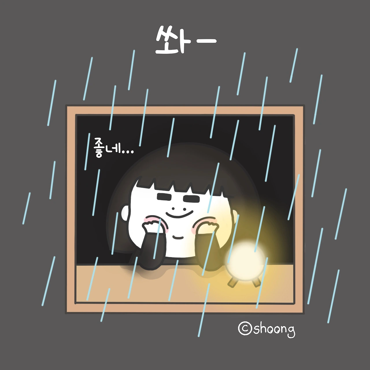 고요하고 적당히 어두운 풍경에 몰아치는 빗소리가 아닌 쏴~하고 시원하게 내리는 빗소리, 귀뚤귀뚤 귀뚜라미 소리까지 더해져 가만히 듣고 있으니 마음이 편안해진다.