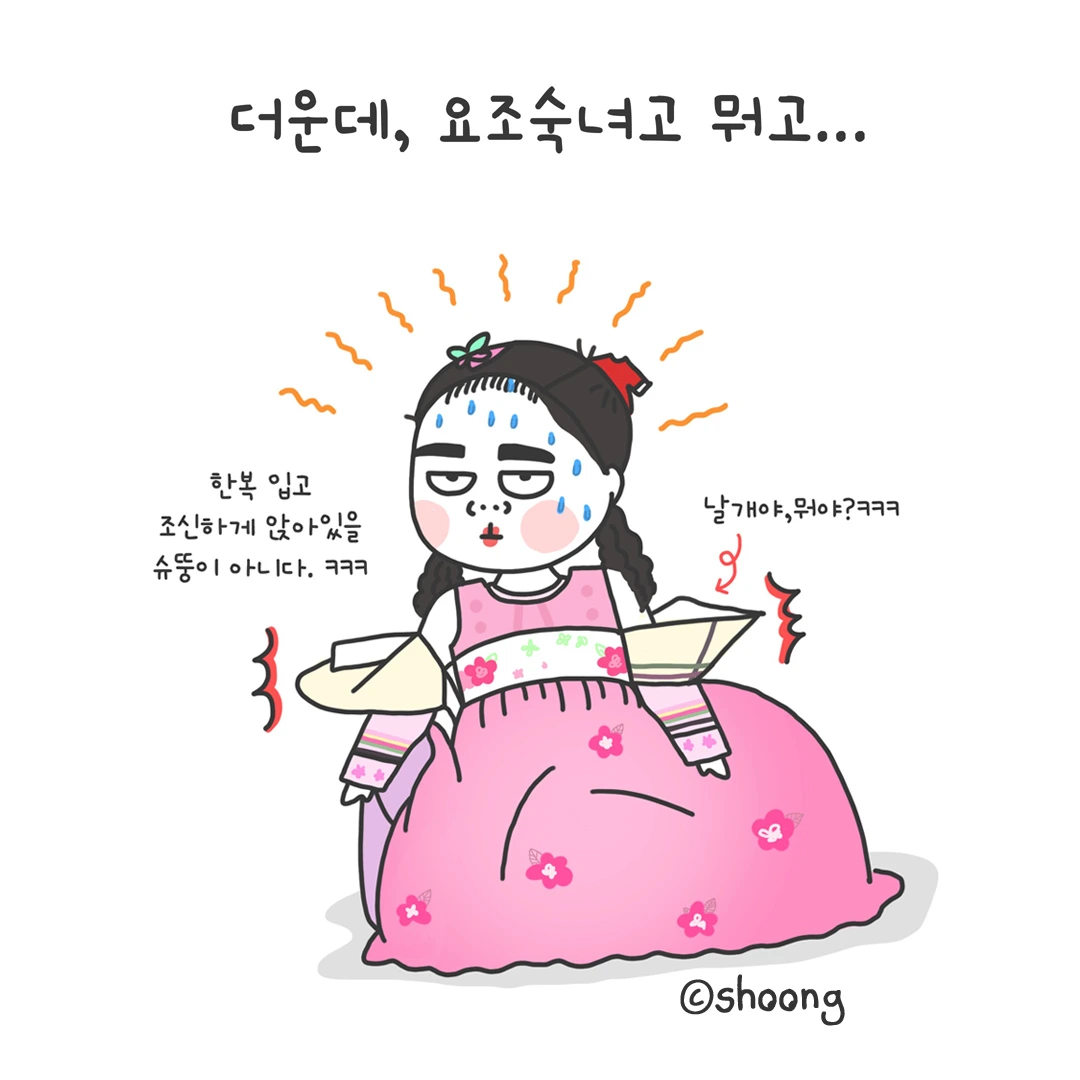한복 입고 조신하게 앉아있는가 싶더니