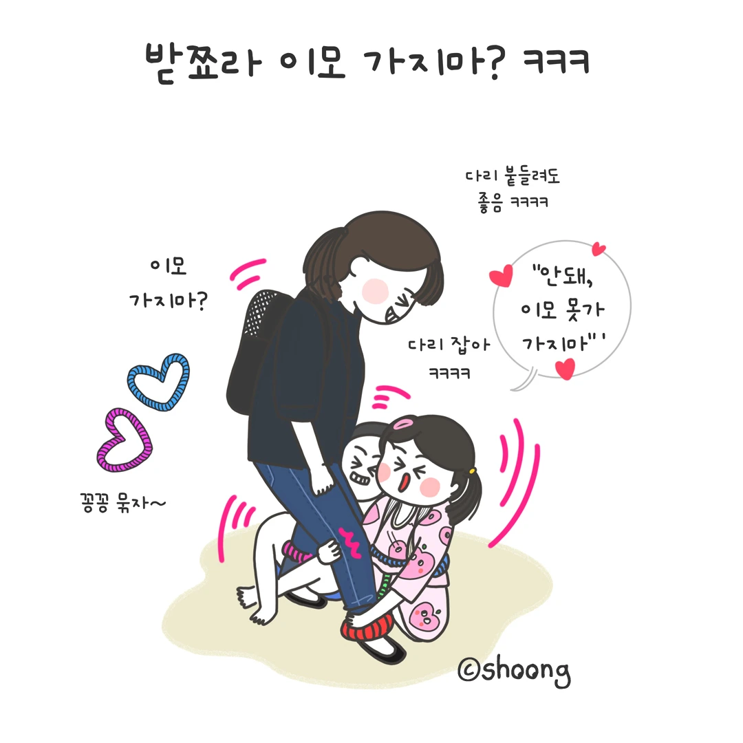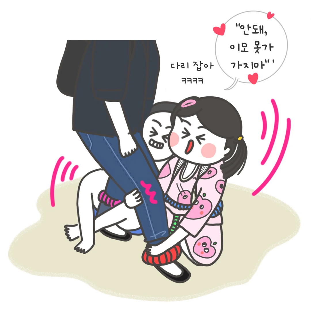 우리 귀여운 조카 3호, 조카 1호 슈뚱과 우리메기가 이모 바짓가랑이를 잡고 "이모 꽁꽁 묶자, 이모 가지 마"라며 장화 신은 고양이 눈을 하고 쳐다본다 ㅋㅋㅋㅋㅋㅋ
