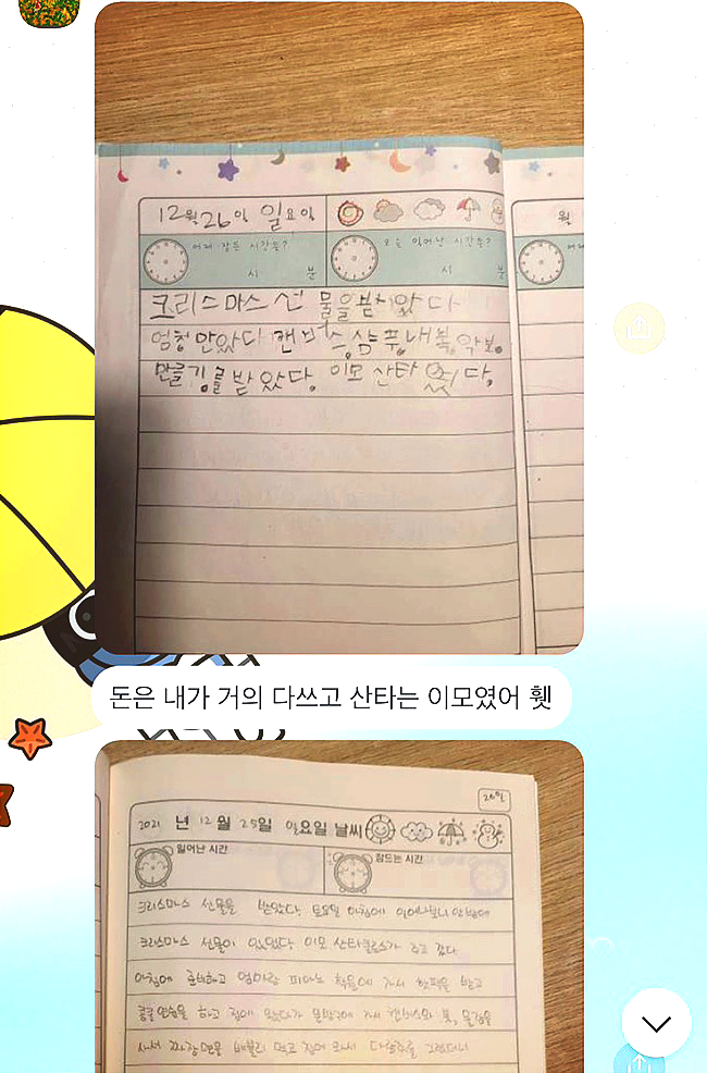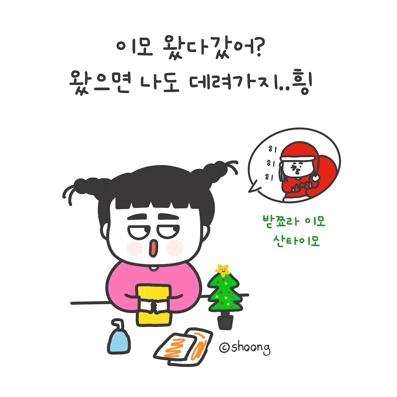 "받쬬라 산타 이모가 선물만 두고 갔어"라고