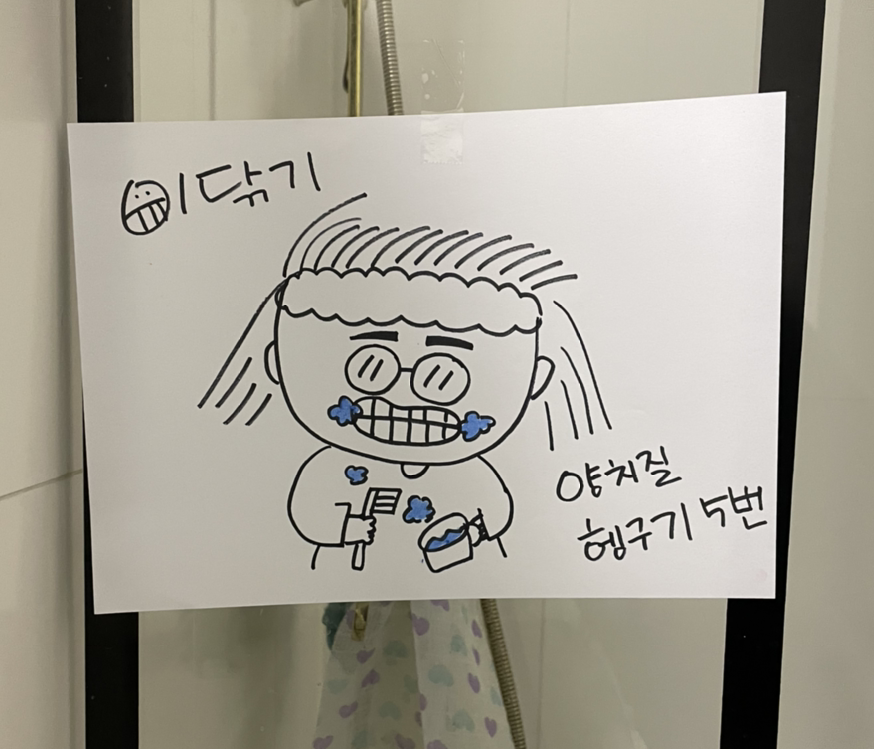 애들이 양치질하고 헹구기를 잘 안 함 헹구기도 중요한데... 그래서 헹구기 5번 강조해서 욕실에 붙여 두고 옴