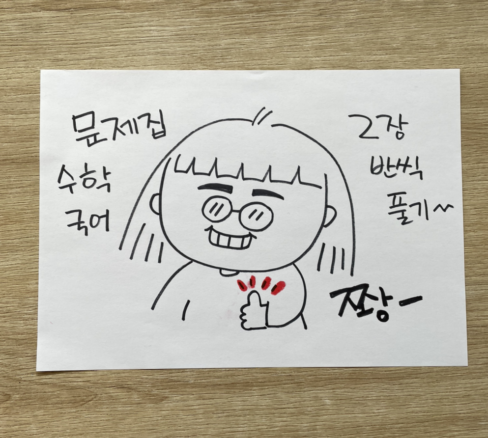 문제집 두장 풀다가 받쬬라 이모랑 반쪽씩 더 풀기로 약속 한 슈뚱 책상 위에 붙여두고 옴