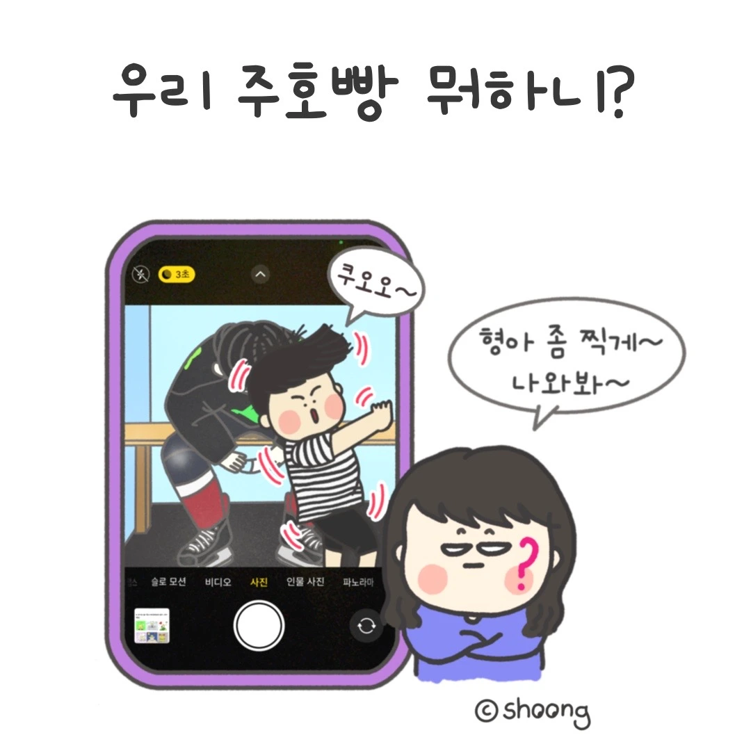 씐나게 사진을 찍고 있는데 둘째 아들 주호빵이