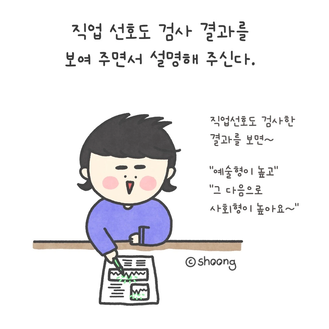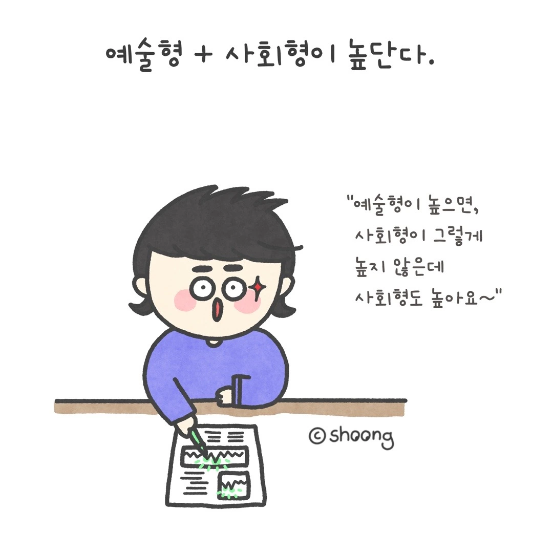 예술형 다음으로 사회형도 높게 나왔는데, 웬만하면 예술형이 높으면 사회형이 낮은데 나는 높게 나왔다고 한다.