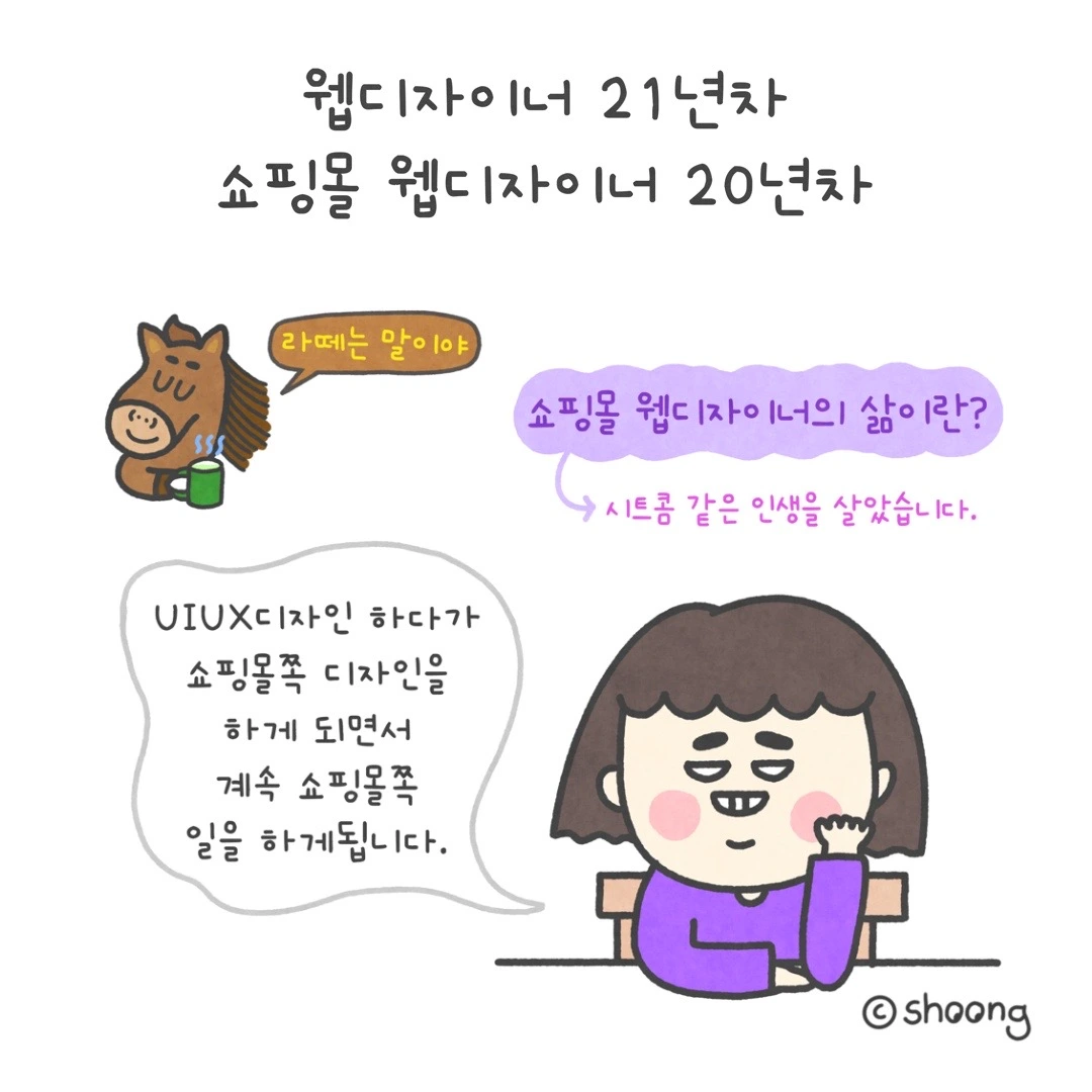 21년 중 1년은 UIUX 쪽 일을 하고 20년은 유통 관련 화사 쪽으로 취업이 되더니 계속 쇼핑몰 디자인 쪽으로 취업이 되면서 평범하게 사는 게 소원일 정도로 시트콤 같은 인생을 살았다.