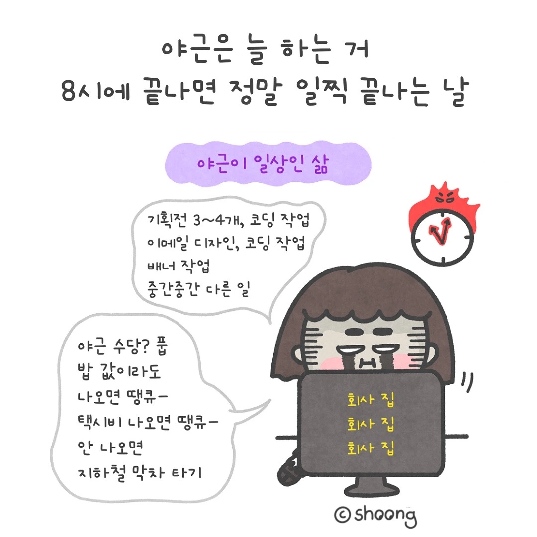 요즘은 법이 바뀌어서 야근 수당을 주는 회사들도 있지만 안 주는 회사들은 여전히 많이 있다.
