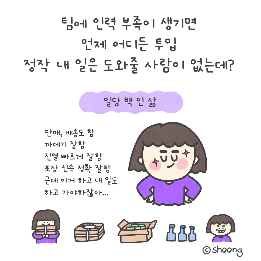 디자인작업을 하다가도 인력이 부족한 곳에 가서 일을 도와주거나 퇴사한 사람의 일까지 내가 땜빵을 해야 한다.