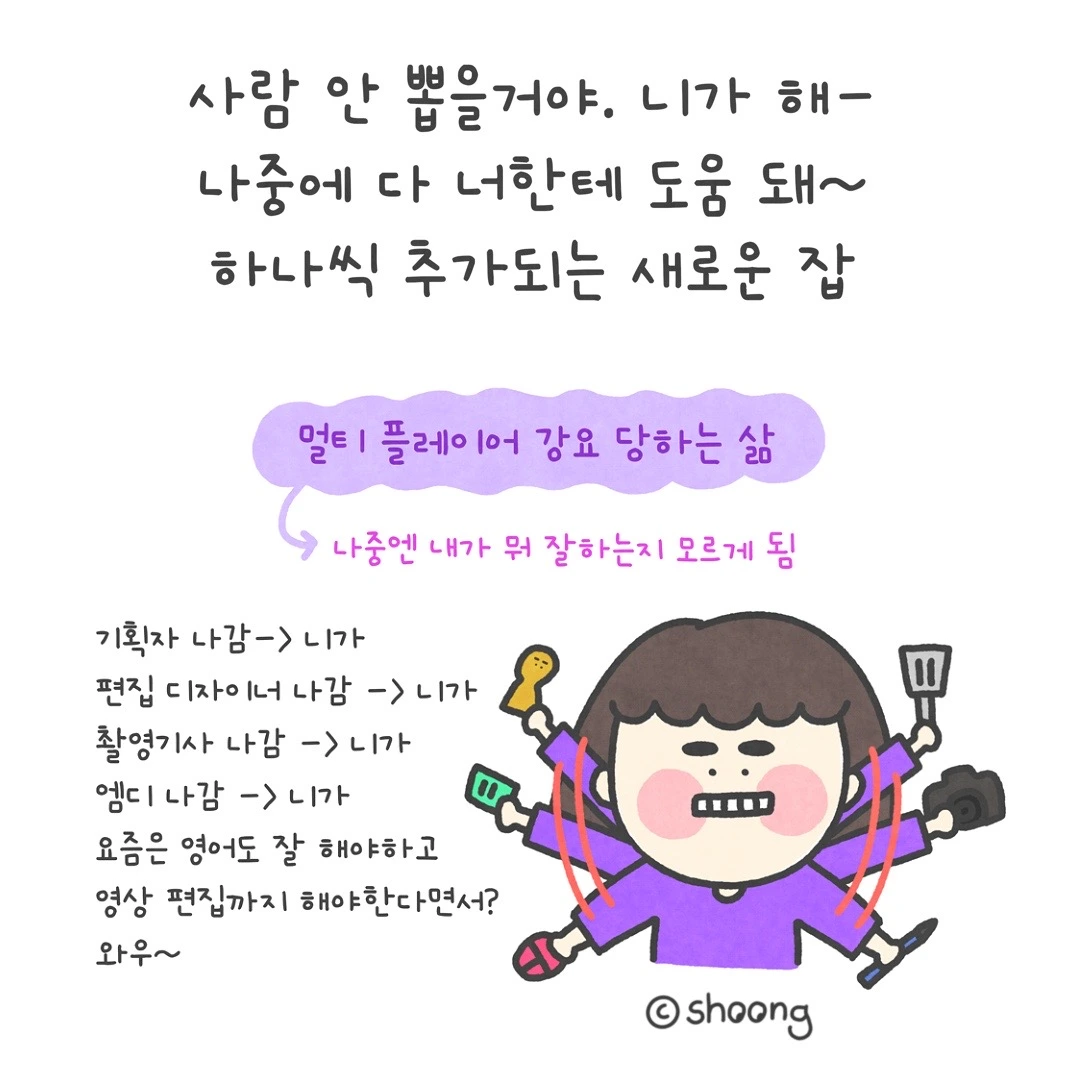 나도 마지막 회사에선 상품 촬영을 비롯해 요리도 하고 상품 데코 작업까지 하고 추가로 연출물 작업도 하고, 쇼핑몰 보다 sns에 신경을 쓰라고 해서 손그림을 그려야 했고, sns 관련 기획, 사진 촬영, 디자인 작업을 하였다.