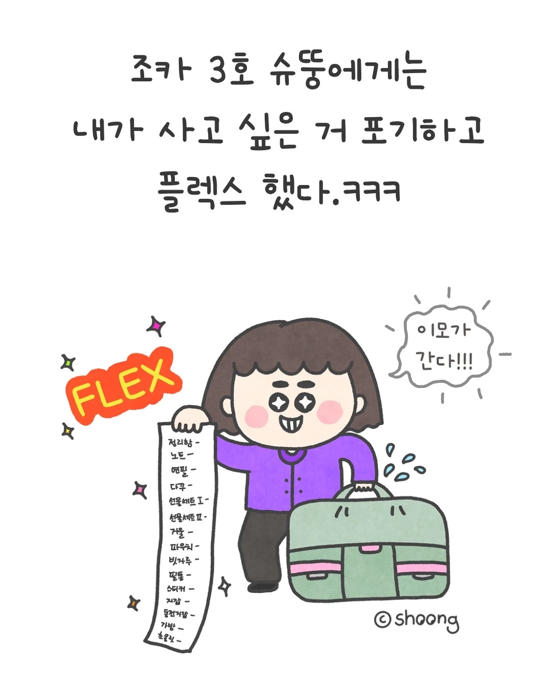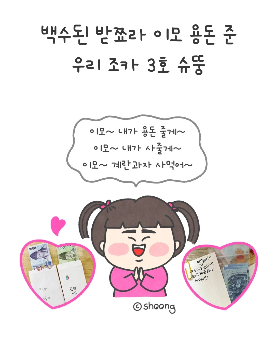 9살 조카 3호 슈뚱은 본인이 천 원, 이천 원 모은 소중한 용돈을 받쬬라 이모에게 과자 사 먹으라고 용돈으로 쥐여 주었다.