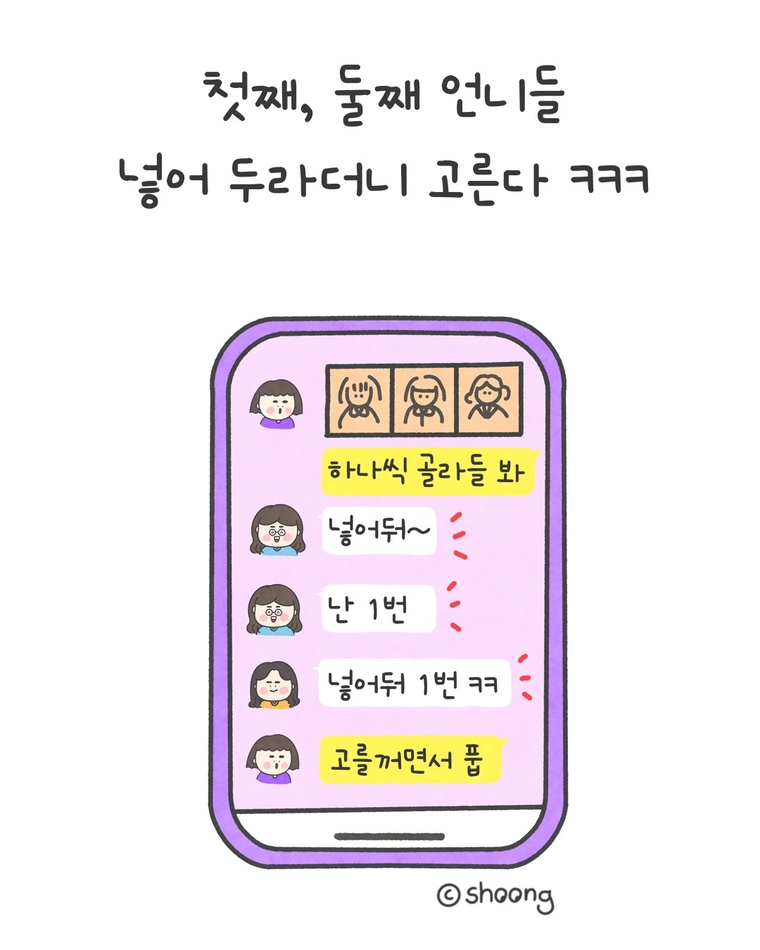 언니들은 내 돈 주고 사기는 아깝고 남이 사주면 좋은 선물을 몇 개 고른 뒤 고르라고 했다.