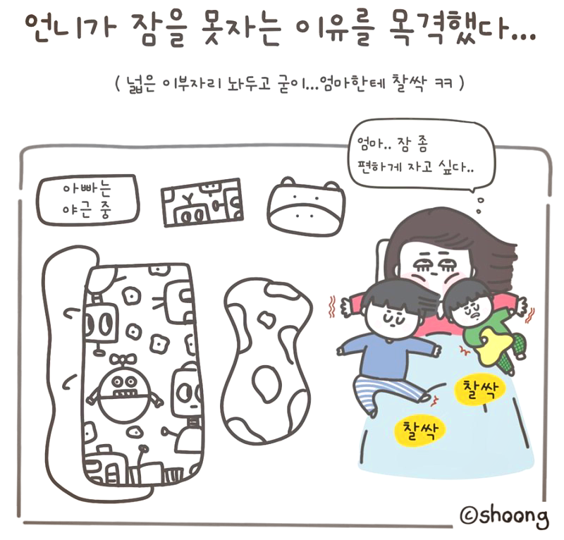 집안일 다 하고 엉덩이 좀 붙여볼까 하면 하면 애들 데리러 가야 하는 시간이고, 애 한 명 데리러 갔다가 또 한 명 데리러 갔다가 놀이터에서 조금이라도 놀아주고 들어오면 금방 또 저녁밥 할 시간이고, 밤에는 숙면을 하고 싶지만 애들이 넓은 자리 놔두고 굳이 엄마 옆에 찰싹 붙어 자면서 자다가 깨고 엄마에게 발차기를 하다 보면 어느새 불면증이라는 게 생기고 만다.