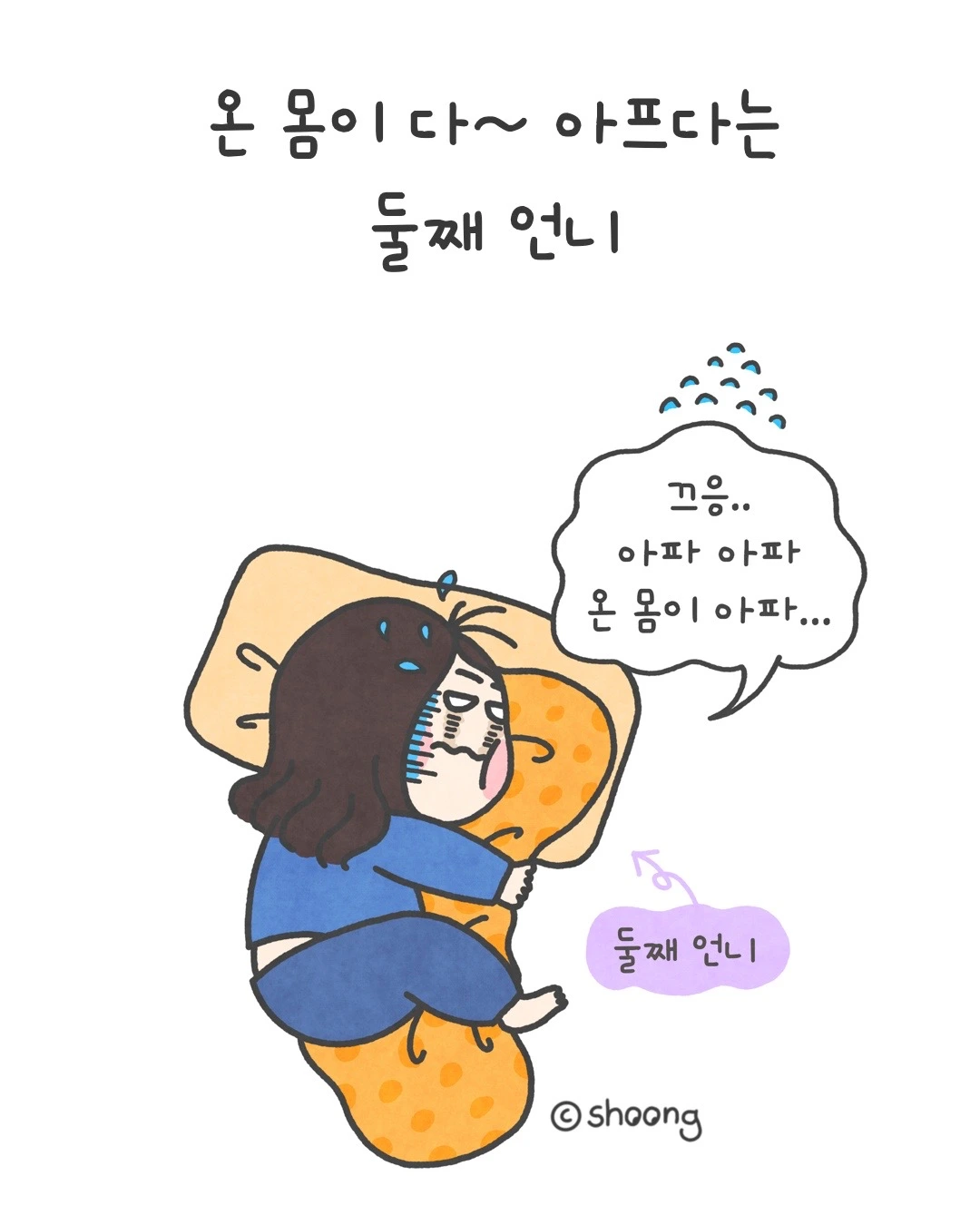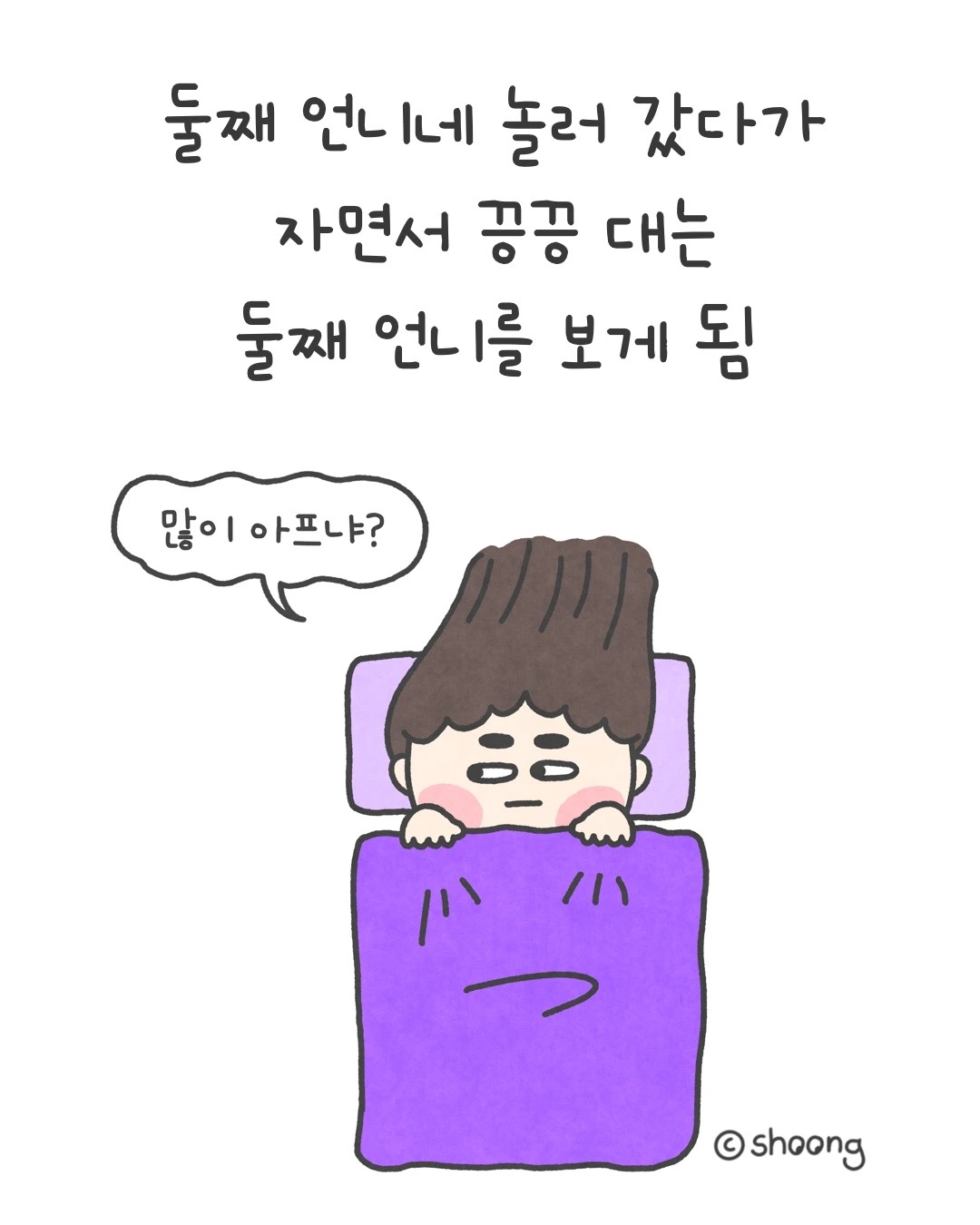 언니는 새우잠 자세를 하고 끙끙 댄다.