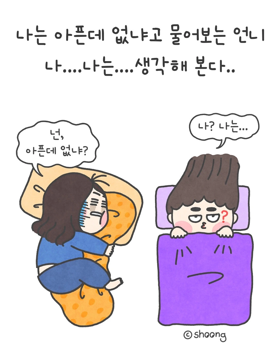 “응... 온몸이 다 아파. 넌 안 아프냐?