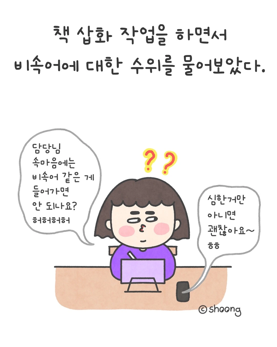 다른 책에도 비속어를 쓰는 것 같았는데 막상 쓰려고 보니 어느 정도 수위를 알아야 할 것 같아 출판사 담당님에게 물어보니 심하지만 않으면 된다기에 나는 회심의 미소를 지으며 그림을 그리기 시작했다.