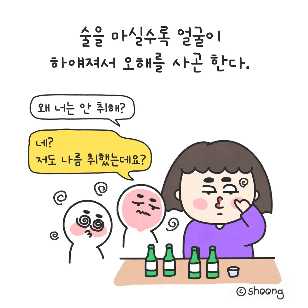술을 마시다 보면 얼굴이 빨개지는 사람들도 많지만 나는 더 하얘지는 편이어서 사람들이 나는 취하지 않은 줄 알고 술을 더 권할 때가 많다.