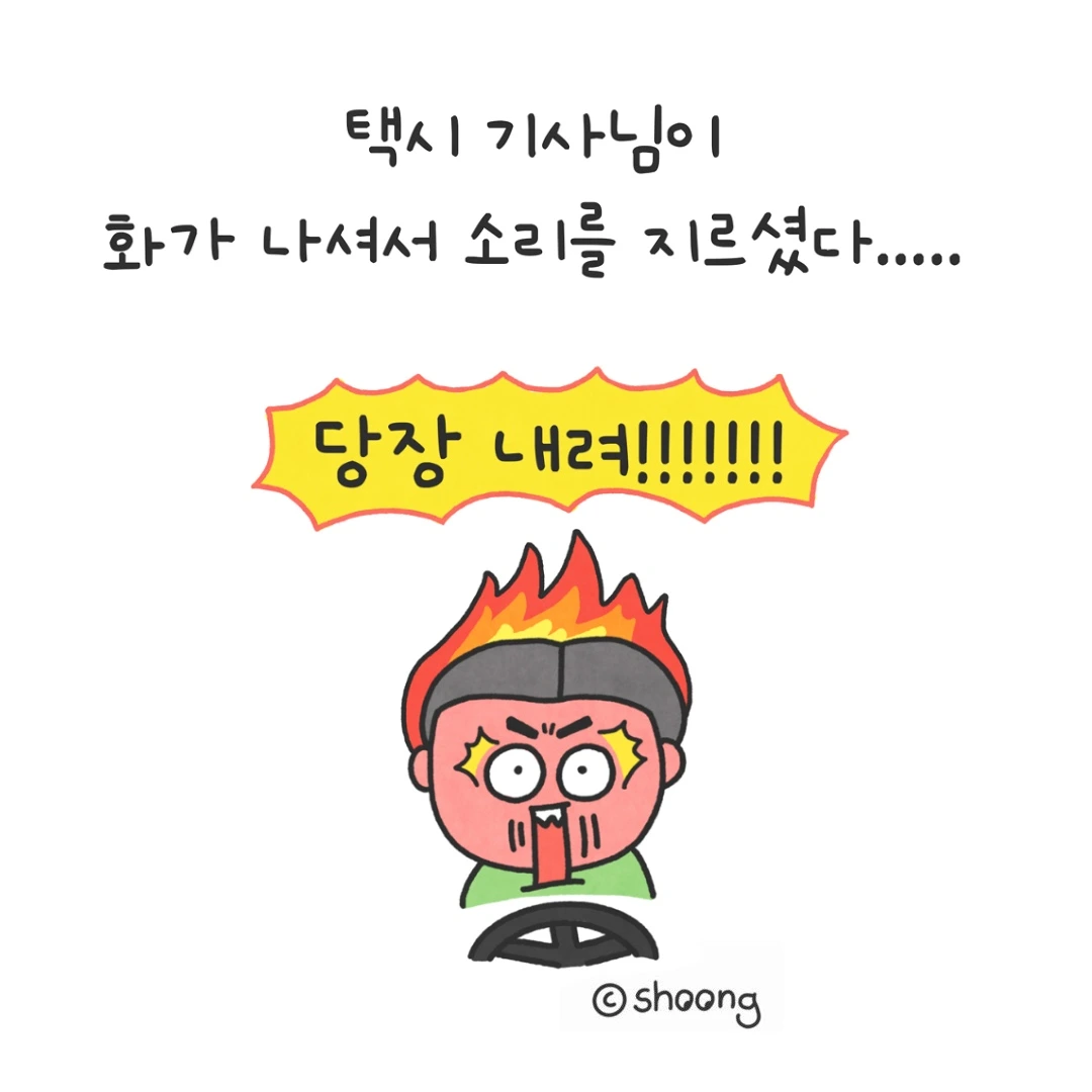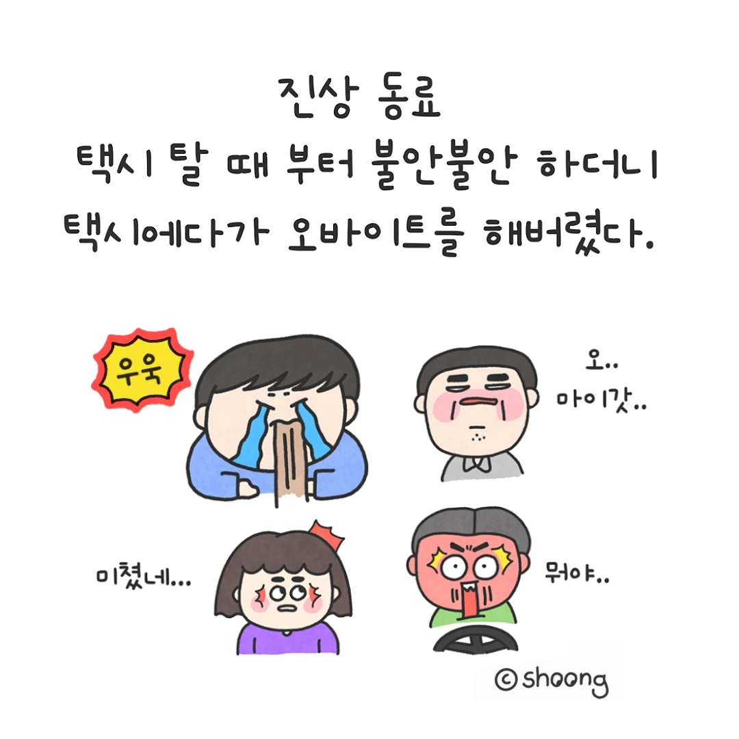 한 명은 여자 친구 이름을 불러대고 있고, 한 명은 너무 어색하고 이 둘과 택시를 타게 되었다.