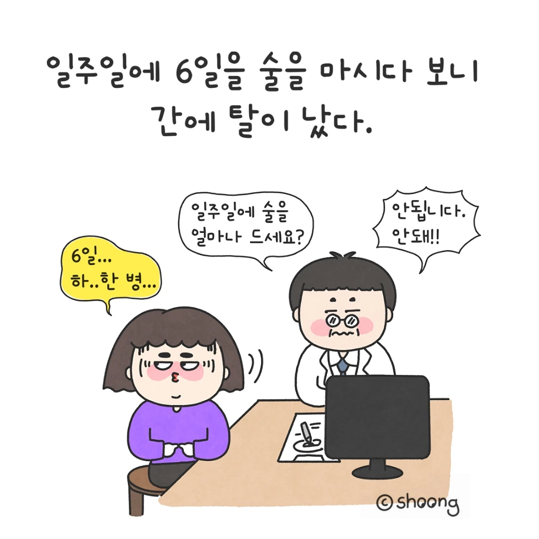 의사 선생님은 남자보다 여자가 술 분해 능력이 현저히 떨어지는데 분해하지도 못하게 매일 술을 마셔서 간 수치가 안 좋아졌다고 나에게 엄청난 잔소리를 하고 금주령을 내리셨다.