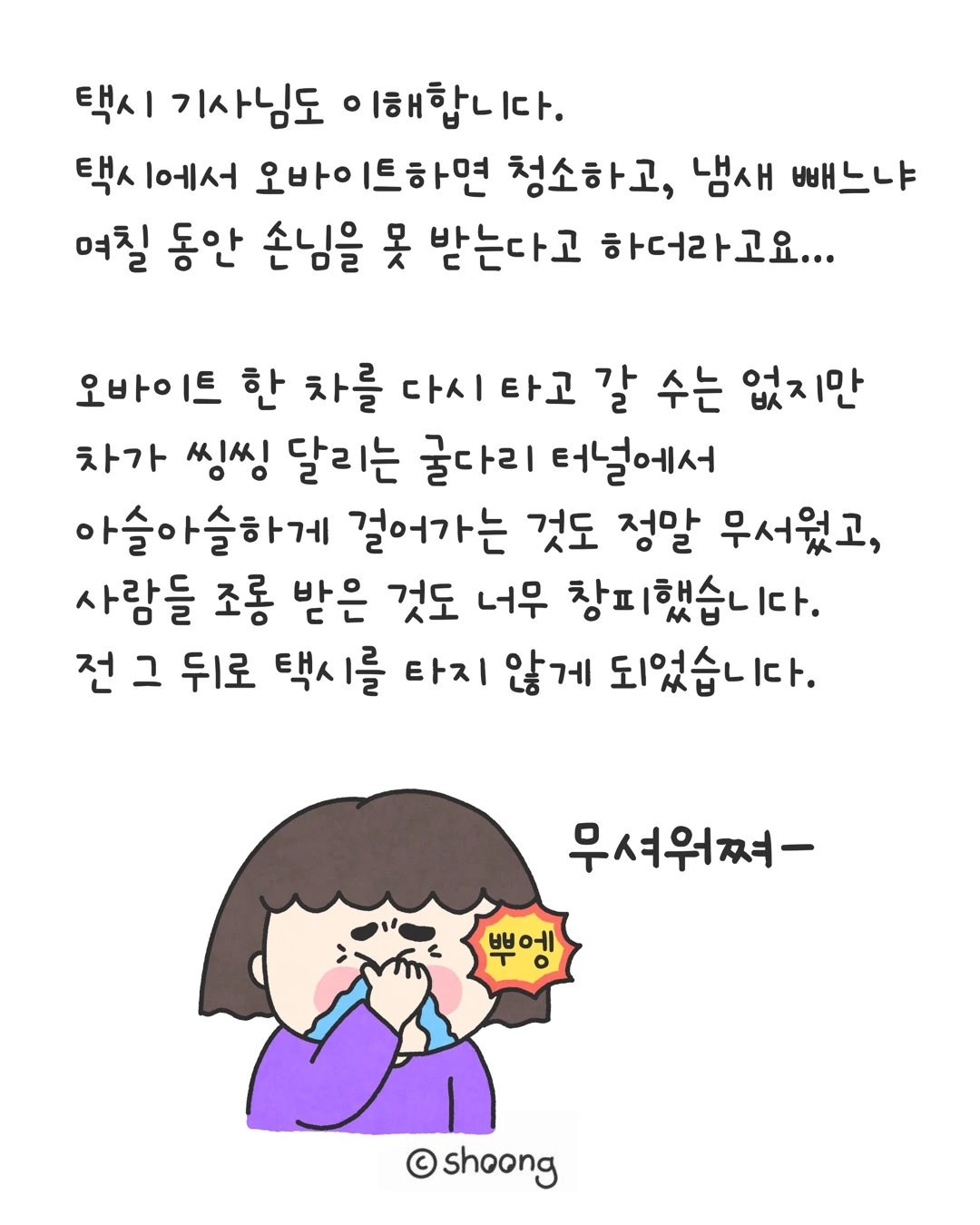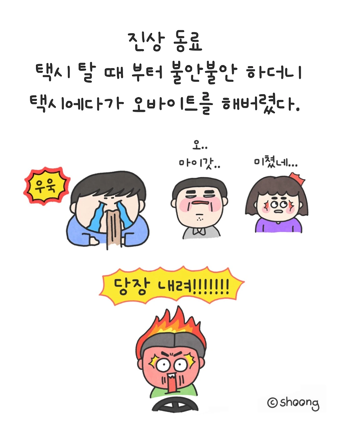 다른 동료 둘은 다른 택시를 탈 수 있는 곳에서 내려주고 아저씨와 나는 집으로 갔다. 집에 가면서 나는 눈물 콧물 흘리면서 아저씨에게 자초지종을 얘기하면서 하소연을 했다.